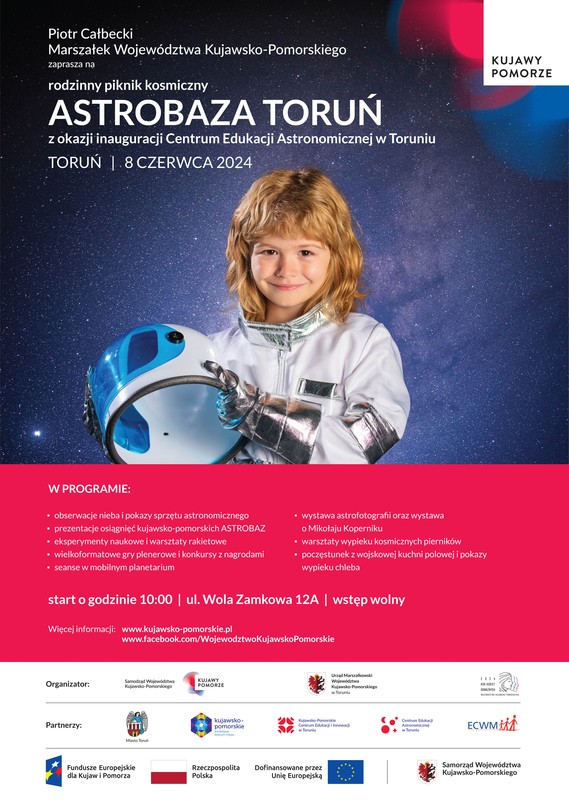 Kosmicznym piknikiem inaugurujemy jutro (8 czerwca) działalność toruńskiego Centrum Edukacji Astronomicznej. W programie Astrobazy Toruń atrakcji między innymi wspólne obserwacje nieba, eksperymenty naukowe, gry plenerowe, warsztaty i poczęstunek z wojskowej kuchni polowej. Każdy znajdzie coś dla siebie. Zapraszamy na Wolę Zamkową 12A.