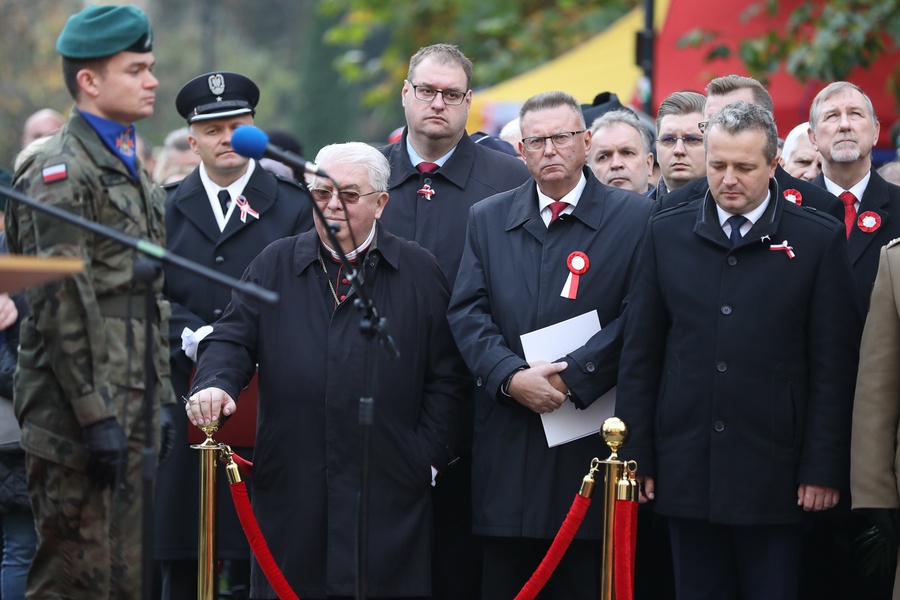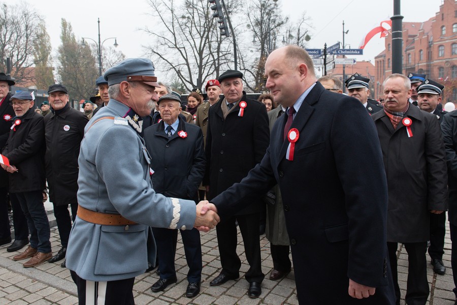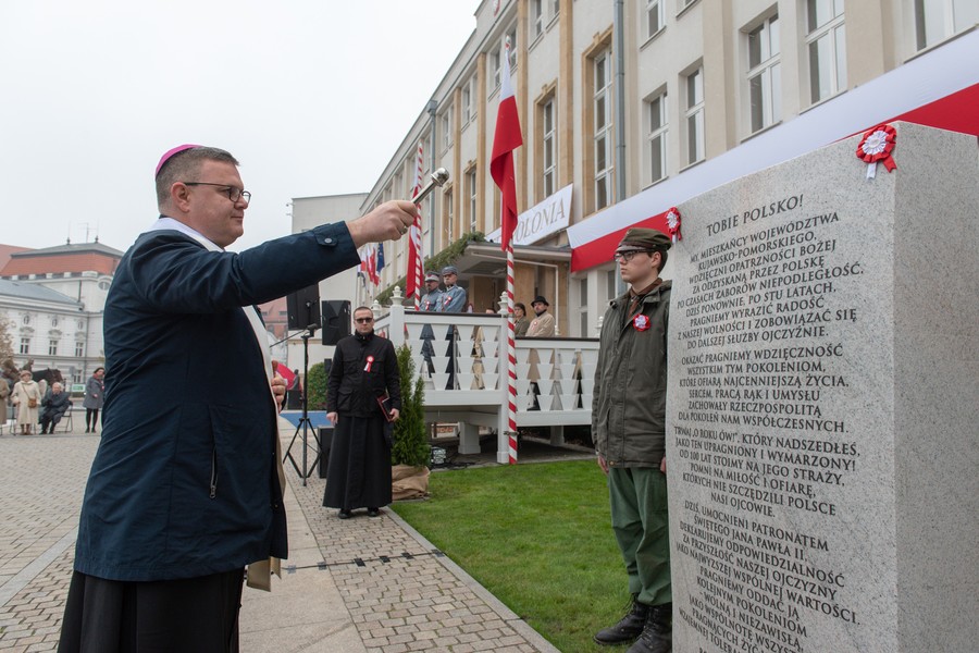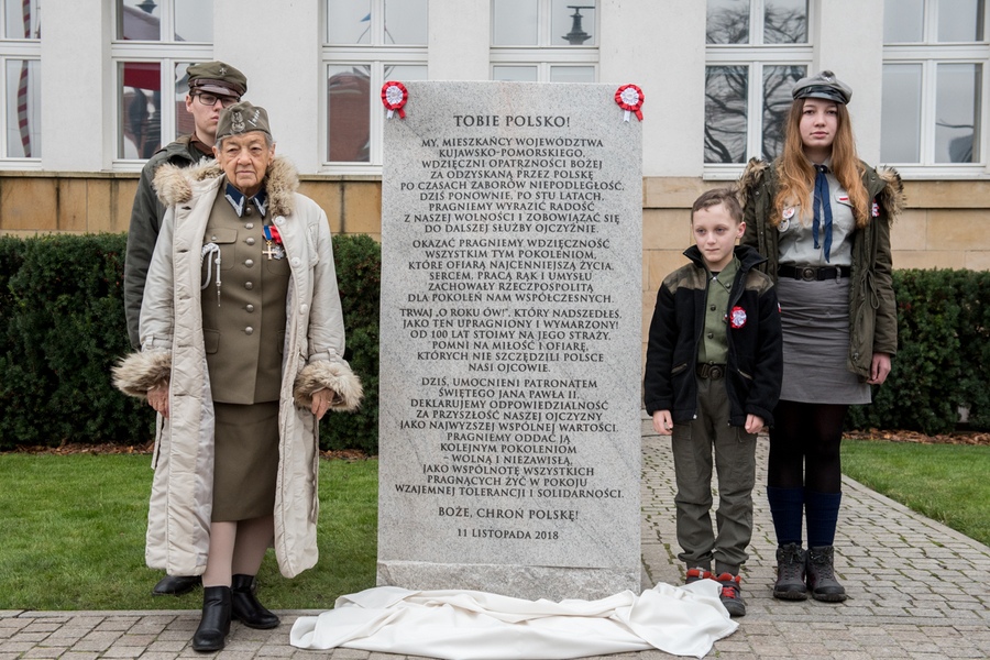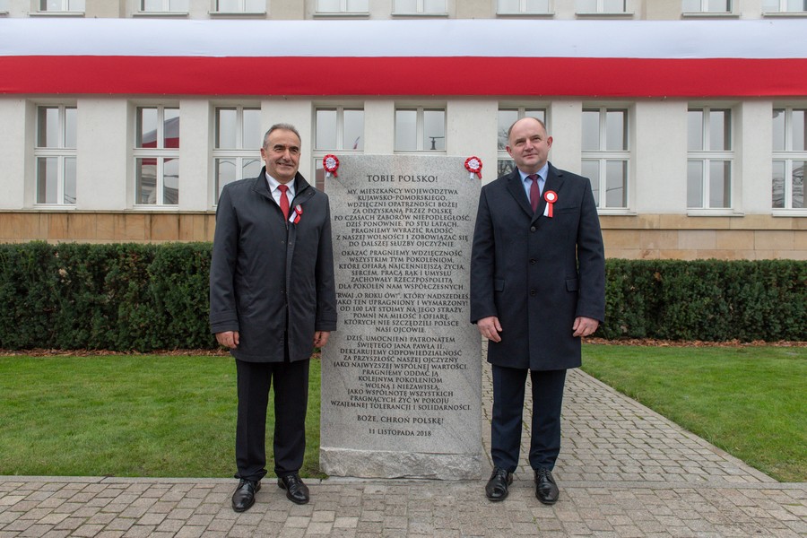 Niedzielne (11 listopada) uroczystości w Toruniu rozpoczęły się przed Urzędem Marszałkowskim ceremonią odsłonięcia tablicy pamiątkowej w związku z setną rocznicą odzyskania niepodległości, z udziałem samorządowców, kombatantów, żołnierzy, strażaków, harcerzy i innych zaproszonych gości. Przed gmachem urzędu stanął 1,7-metrowy granitowy blok, na którym znalazła się treść jubileuszowej deklaracji mieszkańców województwa na stulecie niepodległości (więcej o akcji zbierania podpisów pod deklaracją). Czytaj też: Rok dla niepodległej.