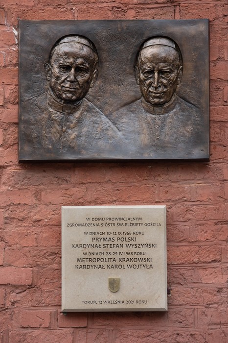 Tablica została wmurowana w fasadę zabytkowej kamienicy przy ulicy Żeglarskiej 9, gdzie od XIX wieku mieści się Dom Prowincji Toruńskiej Zgromadzenia Sióstr św. Elżbiety, w którym podczas wizyt w mieście gościli obaj duchowni. Miejsce to wybrali za względu na jego szczególną rolę w udzielaniu pomocy i wsparciu, na które od wielu lat mogą tu liczyć osoby wkluczone i potrzebujące.
