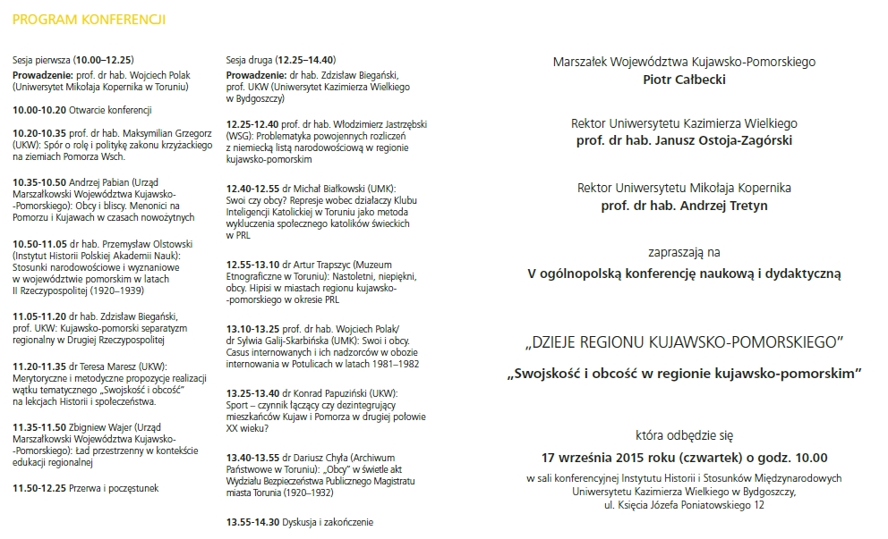 Konferencja odbyła się w czwartek (17 września) w sali konferencyjnej Instytutu Historii i Stosunków Międzynarodowych Uniwersytetu Kazimierza Wielkiego w Bydgoszczy. Zadanie jest realizowane w ramach projektu „Edukacja Regionalna” Wydziału Projektów Edukacyjnych i Stypendiów w Departamencie Kultury, Dziedzictwa Narodowego i Edukacji Urzędu Marszałkowskiego w Toruniu. Projekt jest współfinansowany ze środków Unii Europejskiej w ramach Regionalnego Programu Operacyjnego Województwa Kujawsko-Pomorskiego na lata 2007-2013.