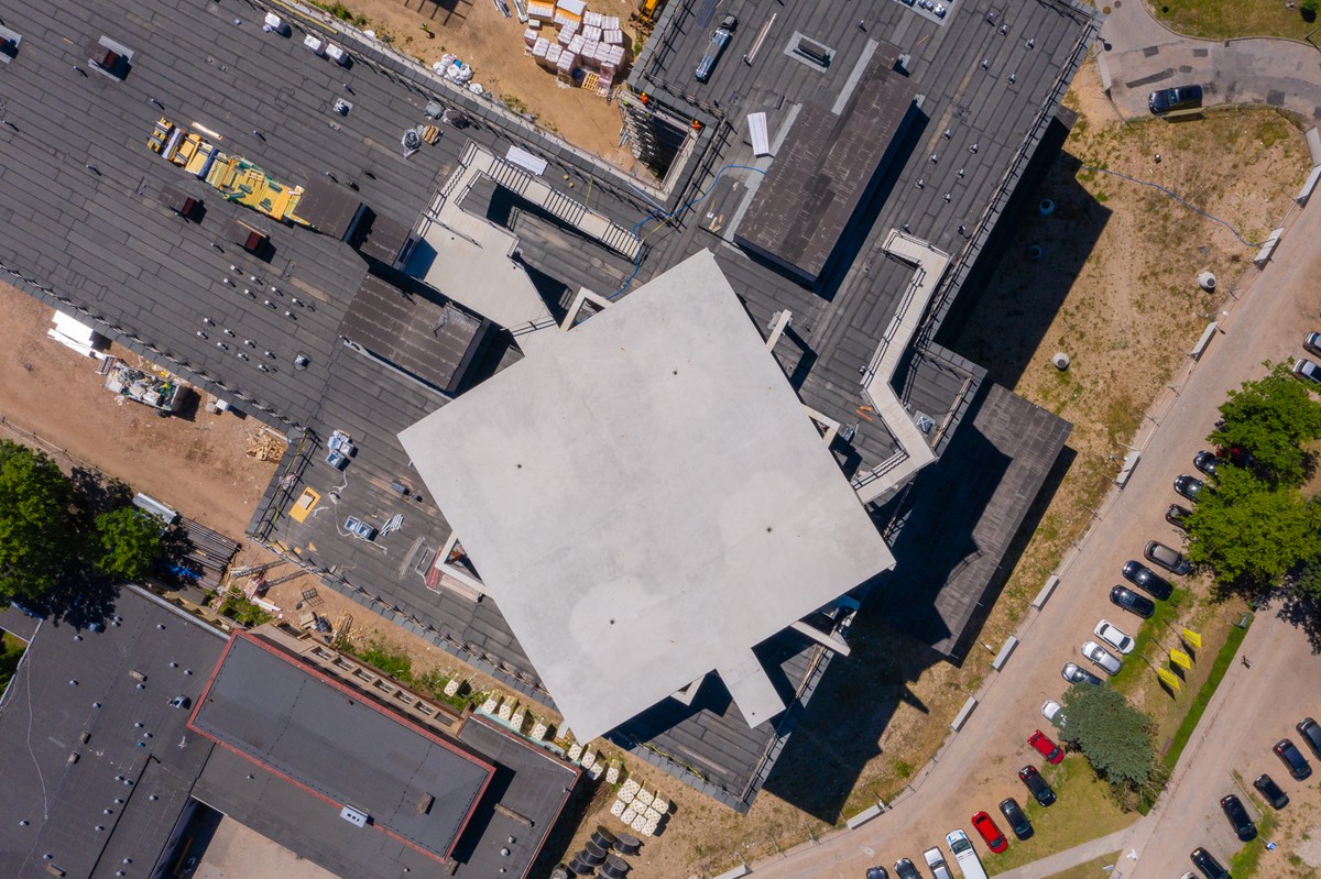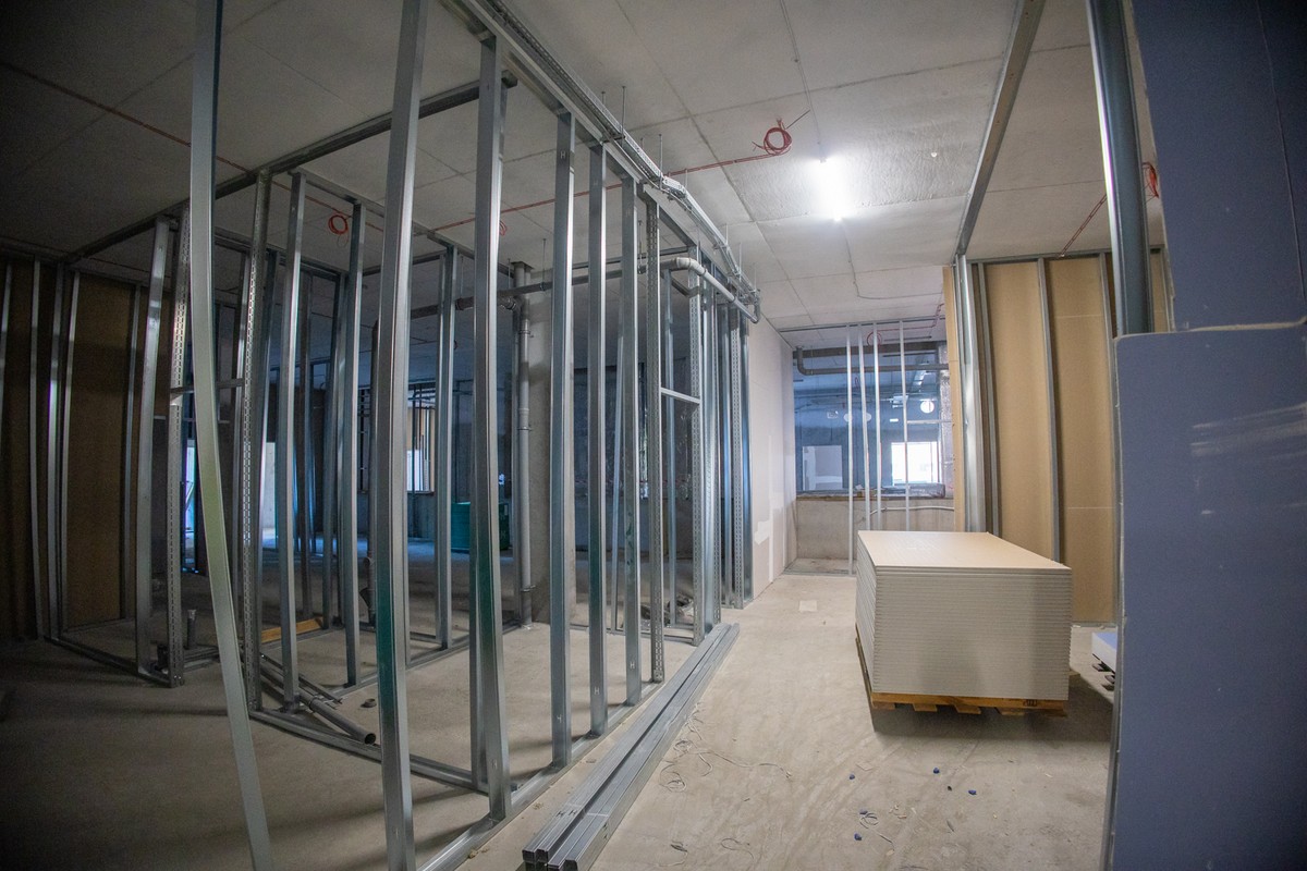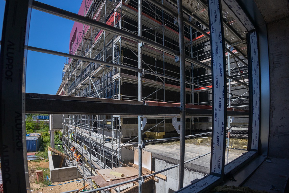 Ekipy wykonawcze prowadzą tu obecnie roboty murarskie, wykończeniowe i instalacyjne obejmujące m.in. montaż lekkich ścianek działowych, tynkowanie, wylewanie posadzek, prace na elewacjach (m.in. montaż elementów szklanych), instalacje wodociągowe i hydrantowe oraz wzmocnienia stropów pod wbudowywane elementy aparatury.