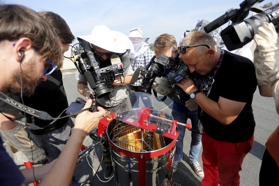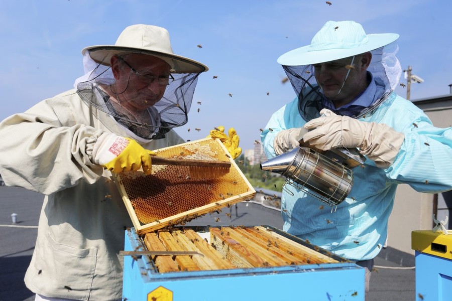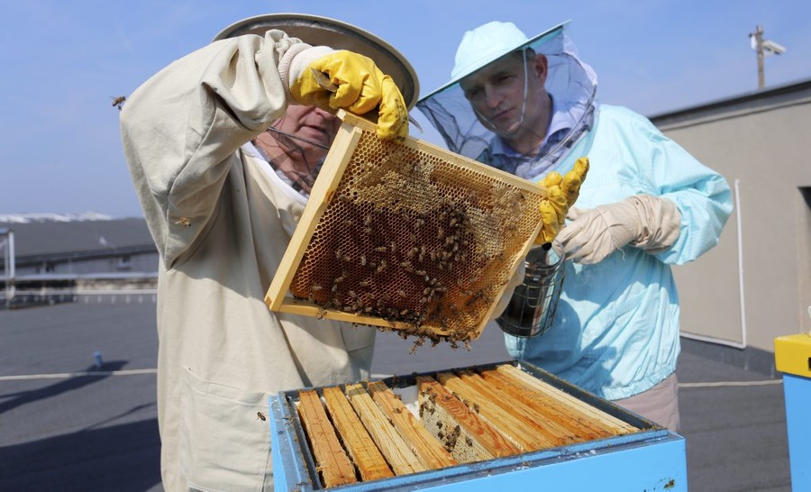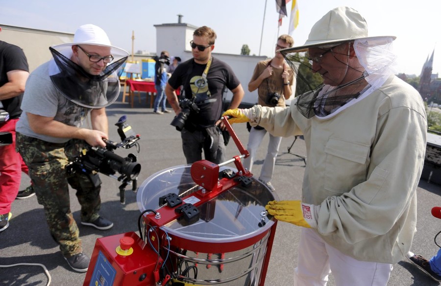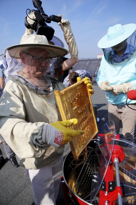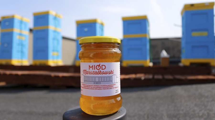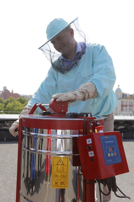 Pierwsza zbiórka miodu z pasieki umieszczonej na dachu Urzędu Marszałkowskiego, fot. Mikołaj Kuras