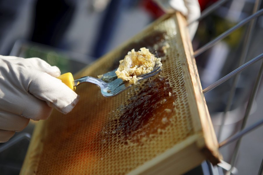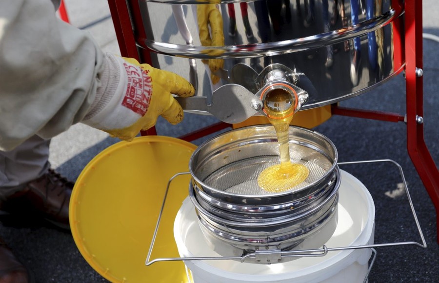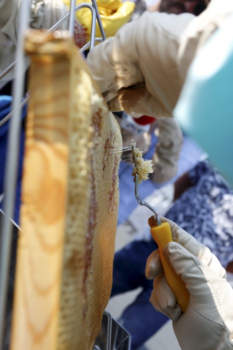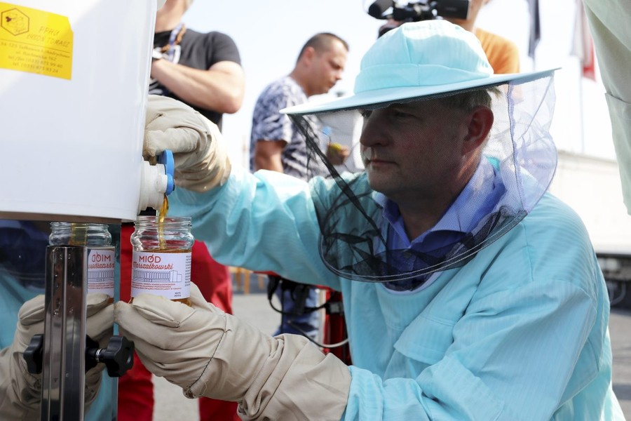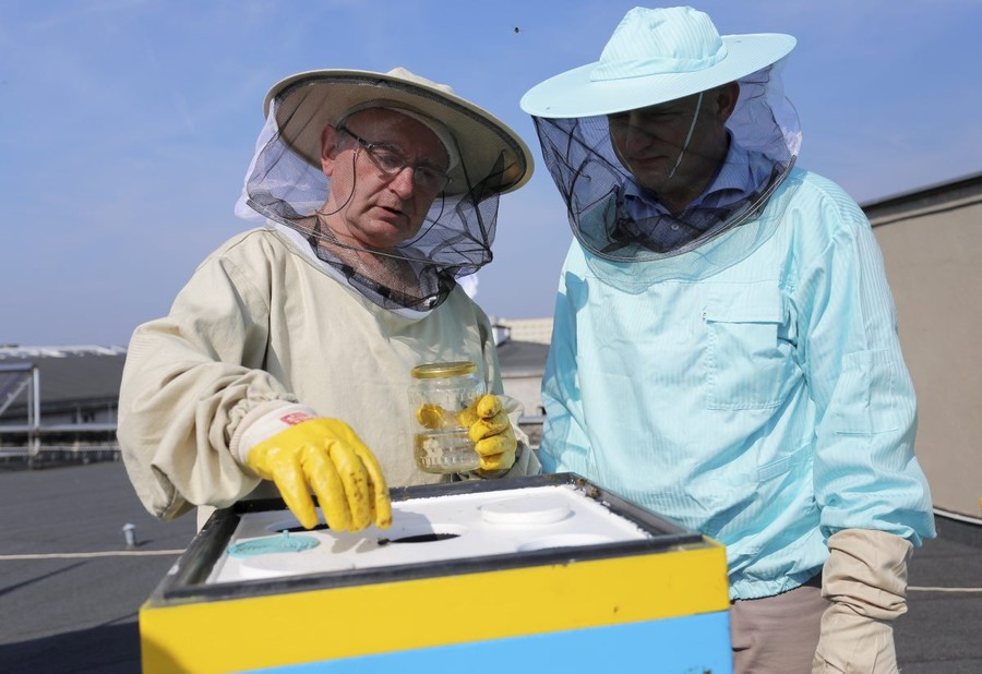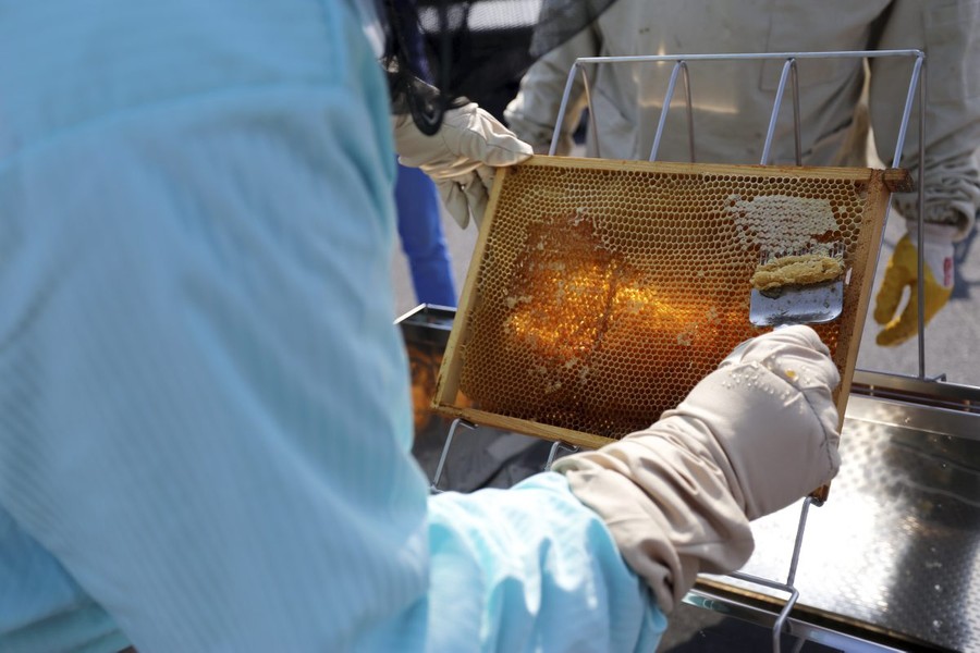 Pierwsza zbiórka miodu z pasieki umieszczonej na dachu Urzędu Marszałkowskiego, fot. Mikołaj Kuras