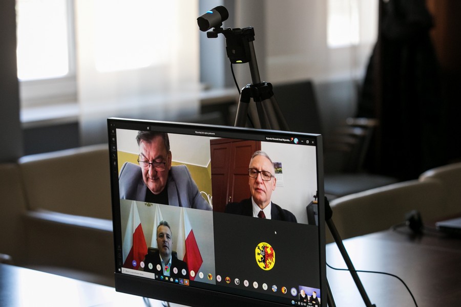 Telekonferencja marszałka Piotra Całbeckiego z udziałem dyrektora Regionalnego Ośrodka Polityki Społecznej Adama Szponki, fot. Andrzej Goiński/UMWKP