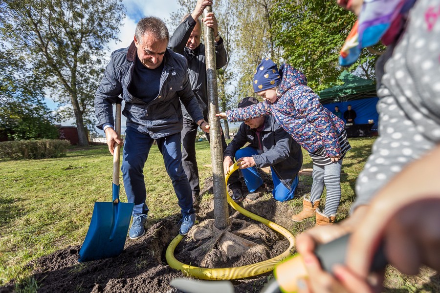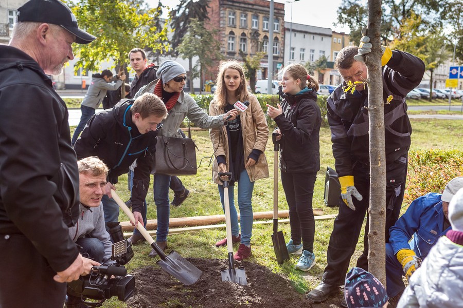 Sadzenie drzewek na skwerze przed Domem Muz z okazji Światowego Dnia Drzewa, fot. Szymon Zdziebło/tarantoga.pl