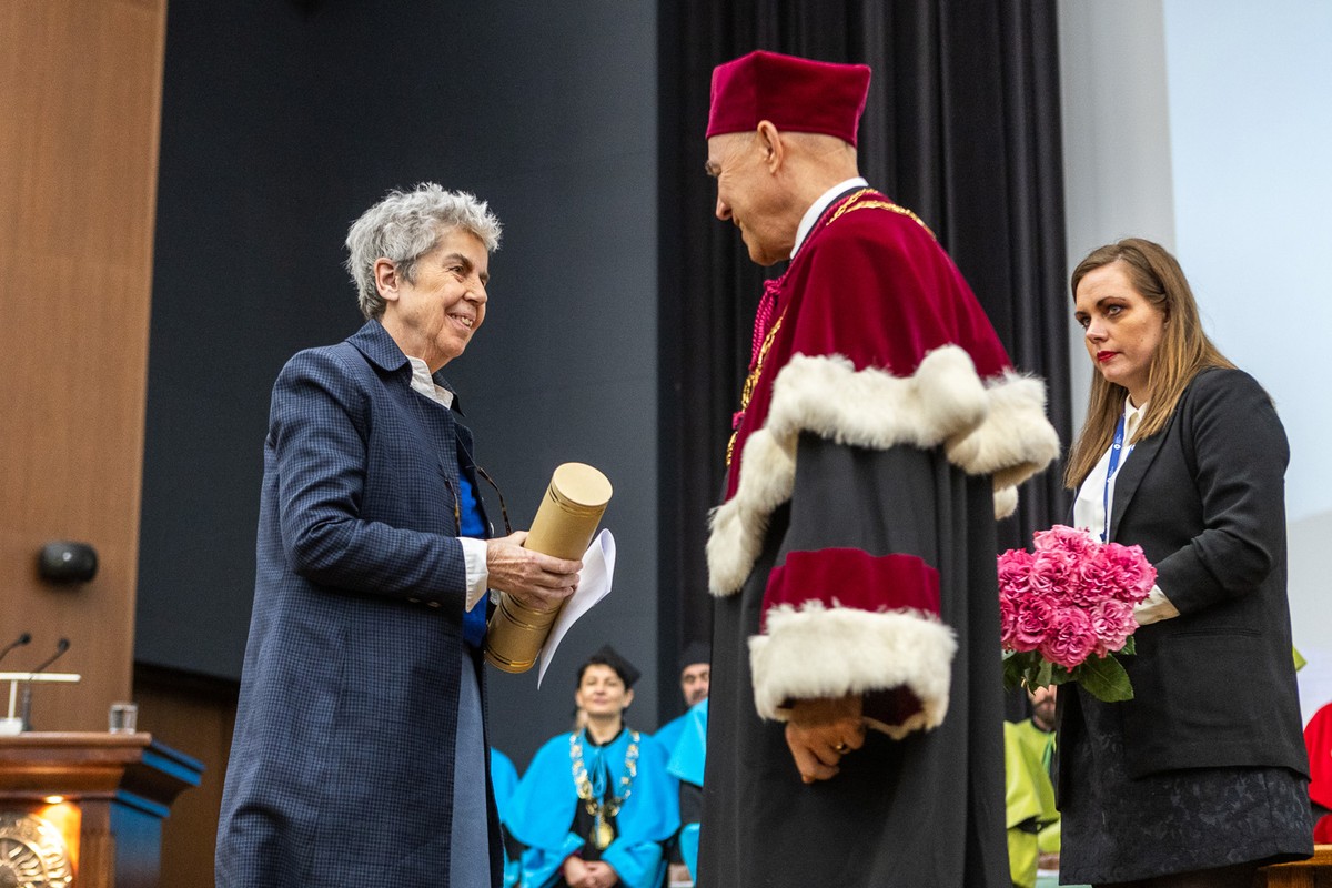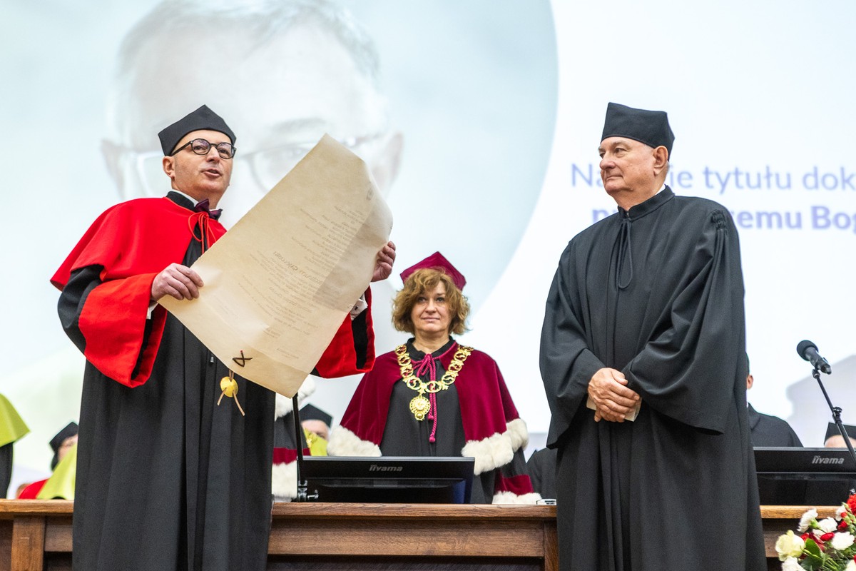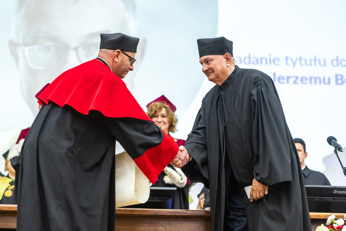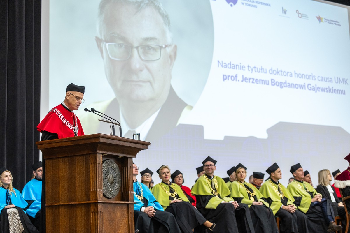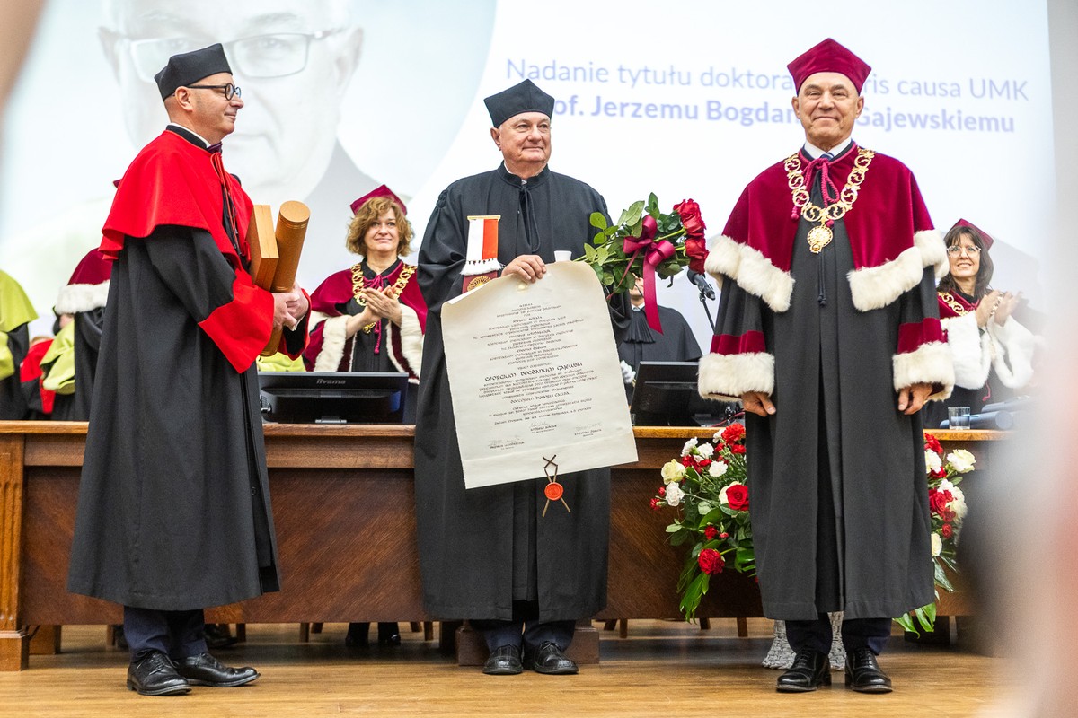 W dalszej części uroczystości, na auli UMK, tytuł doktora honoris causa w uznaniu zasług włożonych w rozwój urologii otrzymał wybitny urolog, emerytowany pracownik Dalhouse University w Halifax (Kanada), prof. Jerzy Bogdan Gajewski.