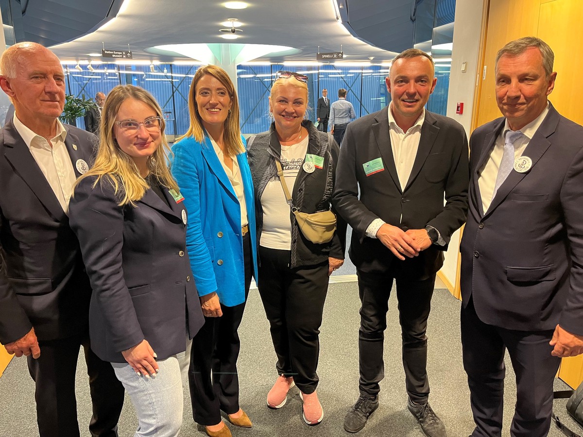 - Członkowie sejmikowej Komisji Współpracy Międzynarodowej w kuluarach Parlamentu Europejskiego, trzecia od lewej przewodnicząca PE Roberta Metsola, fot. Mieszko Matusiak/UMWKP