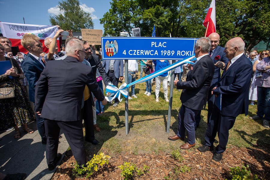 Uroczystość oficjalnego nadania nazwy „Plac 4 Czerwca 1989 roku” rozpoczęła się o godzinie 12. To nawiązanie do plakatu „Solidarności” z kampanii wyborczej w 1989 roku. Widniał na nim symbolizujący walkę o wolność szeryf, grany w filmie „W samo południe” przez Gary’ego Coopera.