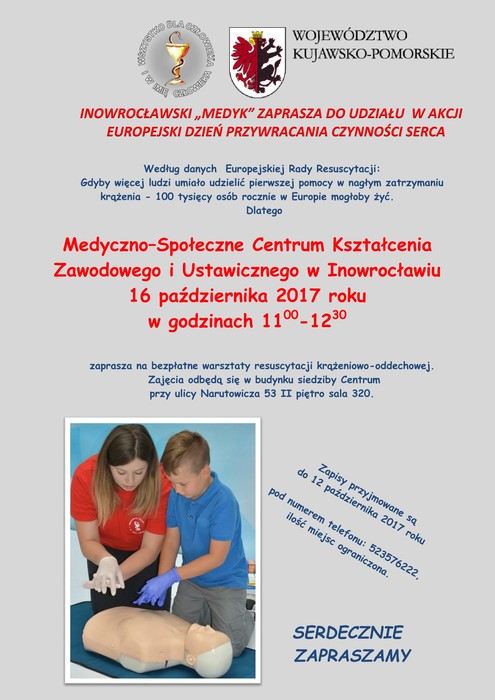 Medyczno-Społeczne Centrum Kształcenia Zawodowego i Ustawicznego w Inowrocławiu zaprasza na bezpłatne warsztaty resuscytacji krążeniowo-oddechowej. Szkolenie odbędzie się 16 października.