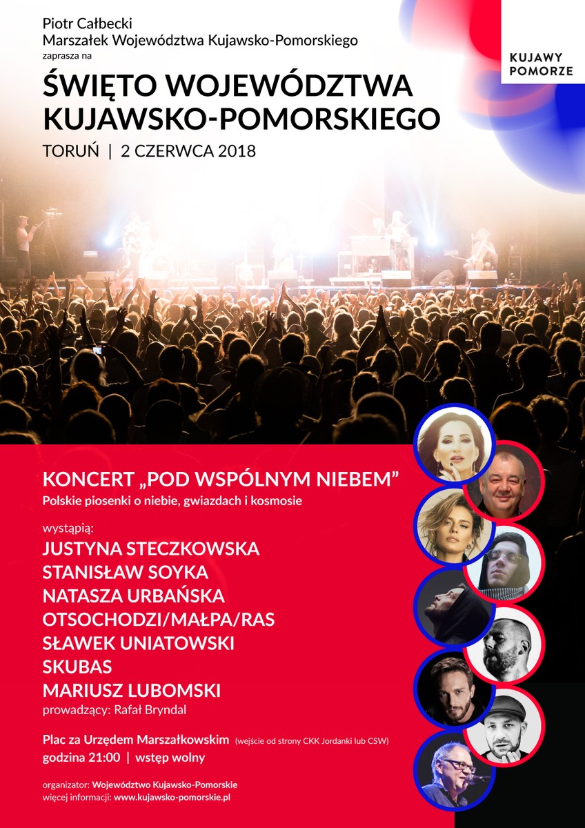 Jedną z głównych atrakcji Święta Województwa był sobotni (2 czerwca) plenerowy koncert „Pod wspólnym niebem” z udziałem gwiazd na placu za Urzędem Marszałkowskim w Toruniu. Piosenki, których motywem przewodnim było niebo, gwiazdy i kosmos zaśpiewali Justyna Steczkowska, Stanisław Soyka, Sławek Uniatowski, Natasza Urbańska, Otsochodzi, Małpa, Ras, Skubas i Mariusz Lubomski.