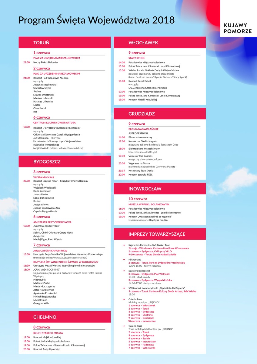 Trwają obchody Święta Województwa Kujawsko-Pomorskiego. W sobotę (2 czerwca) bawiliśmy się w Toruniu podczas koncertu „Pod wspólnym niebem”, pokazu balonowego oraz pikniku rodzinnego „Michayland”. W niedzielę (3 czerwca) zaprosiliśmy do Bydgoszczy na festyn „Bajkowa Bydgoszcz” oraz koncert „Wyspa kina”.