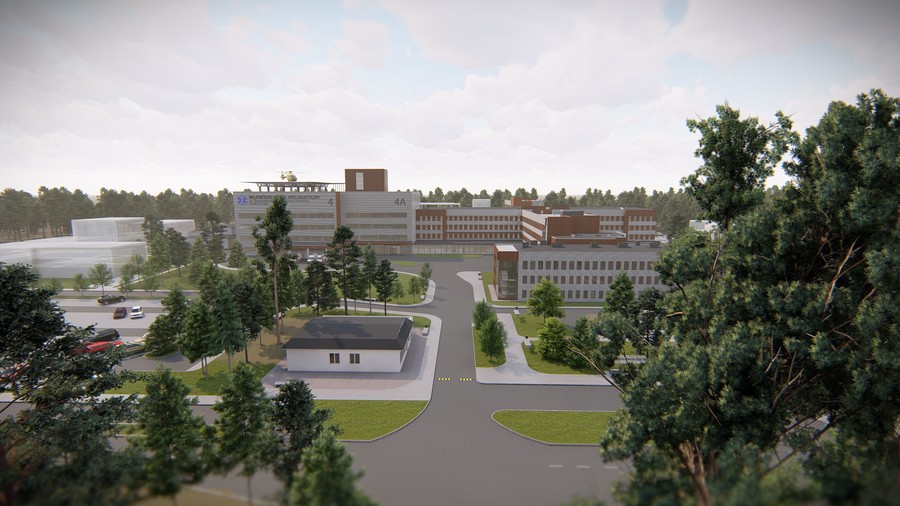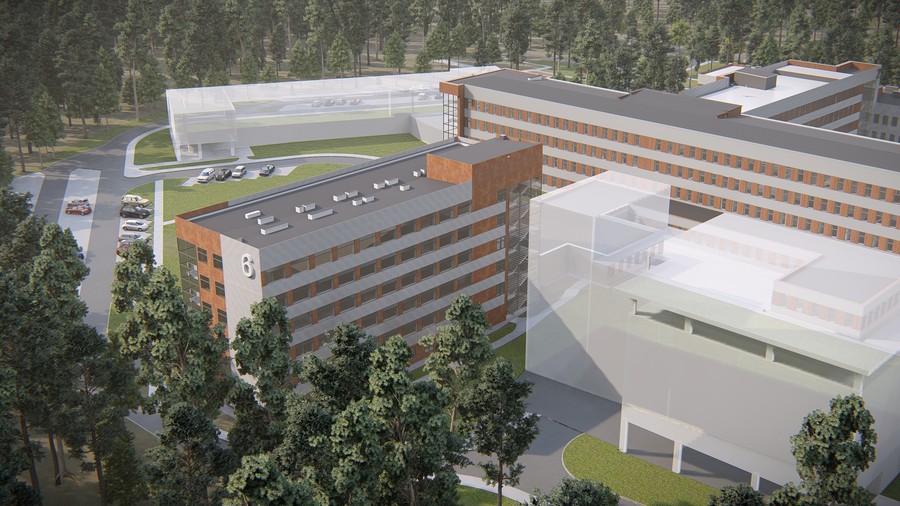 Nowoczesny i funkcjonalny nowy budynek główny, serce lecznicy, stanie w miejscu wyburzonego jednego z istniejących pawilonów. Na parterze mieścić się będą szpitalny oddział ratunkowy oraz oddział anestezjologii i intensywnej terapii. Na pierwszym piętrze znajdą się blok porodowy oraz oddziały patologii ciąży, położnictwa i neonatologii. Drugie piętro to przestrzeń zaplanowana dla oddziałów ortopedii i traumatologii oraz chirurgii ogólnej. Złożony z siedmiu sal zabiegowych zintegrowany blok operacyjny znajdzie miejsce na trzecim piętrze; sąsiadować z nim będzie oddział neurochirurgiczny. Ostatnie, czwarte piętro zostało pomyślane jako przestrzeń techniczna, mieszcząca m.in. maszynerię wentylacyjną i klimatyzacyjną obiektu. Zwieńczeniem budynku będzie platforma z lądowiskiem dla śmigłowców medycznych, zaś w przyziemiu znajdą się apteka szpitalna, centralna sterylizatornia i szpitalna dezynfekcja.