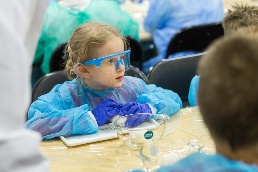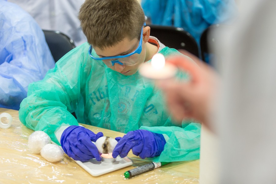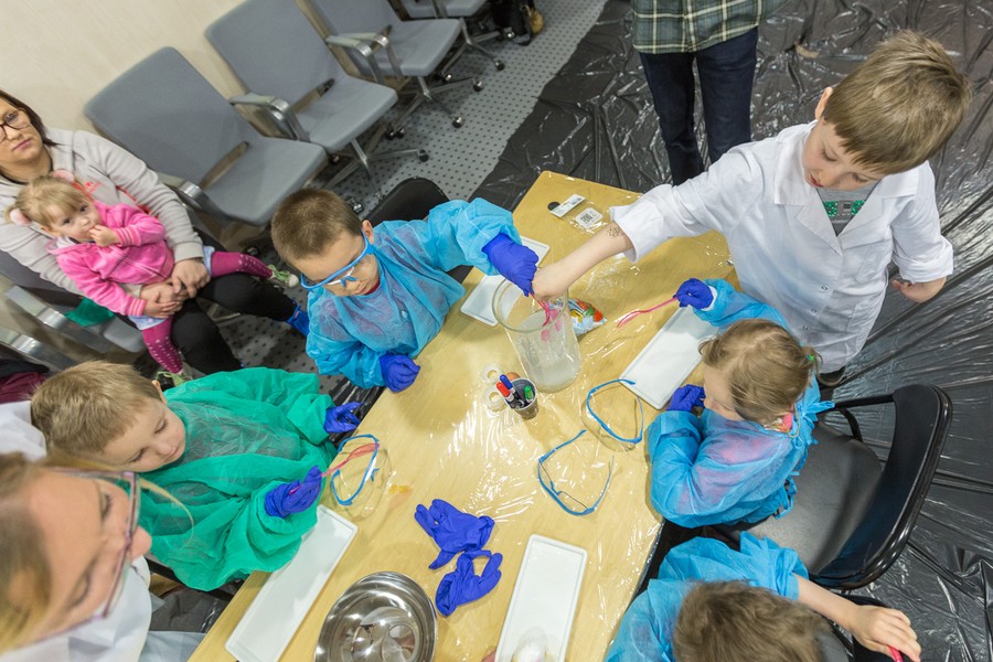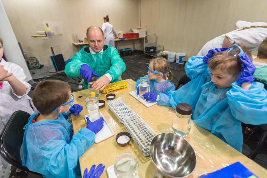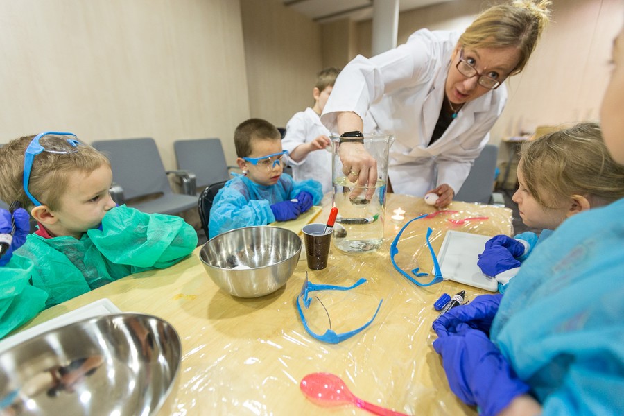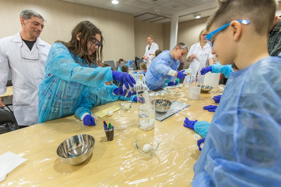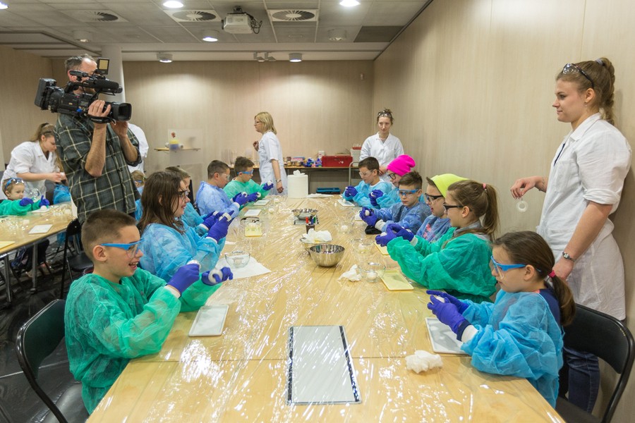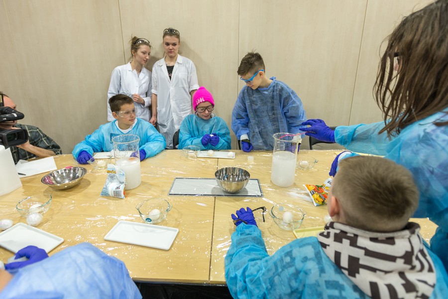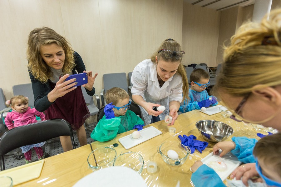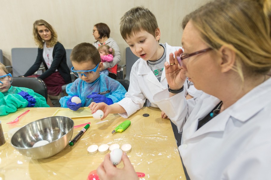 Naukowcy Uniwersytetu Mikołaja Kopernika w Toruniu przygotowali dla dzieci i młodzieży pokaz chemiczny w popularnym wydaniu. Uczestnicy warsztatów mieli okazję sprawdzić elastyczność i wytrzymałość surowych jajek, między innymi spacerując po jajecznym chodniku. Inną niespodzianką była obserwacja, jak zachowuje się jajo w solance, jak powstają przebarwienia na skorupce oraz jak wygląda jajko w żelu. Na zakończenie spotkania nasi goście otrzymali wielkanocne upominki.