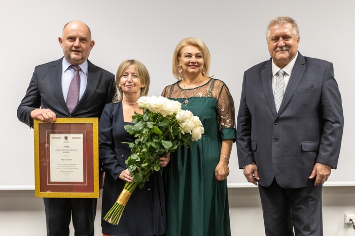 Kujawsko-Pomorski Lider Edukacji, gala nagród, na zdęciu od lewej: marszałek Piotr Całbecki, pani Małgorzata Białek, przewodnicząca sejmiku województwa Elżbieta Piniewska i członek zarządu województwa Sławomir Kopyść, fot. Szymon Zdziebło/tarantoga.pl dla UMWKP