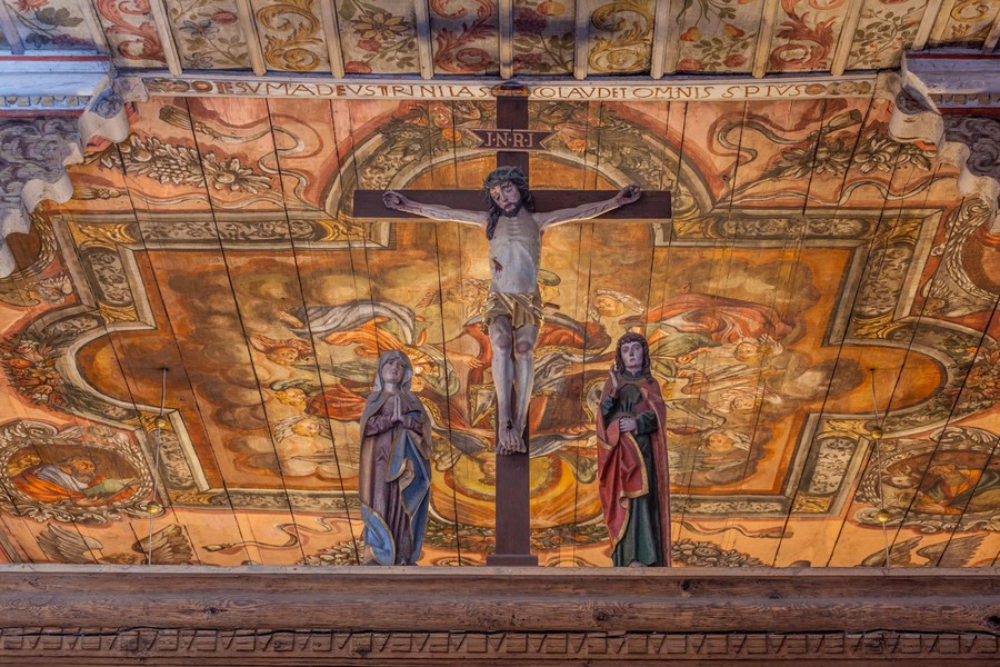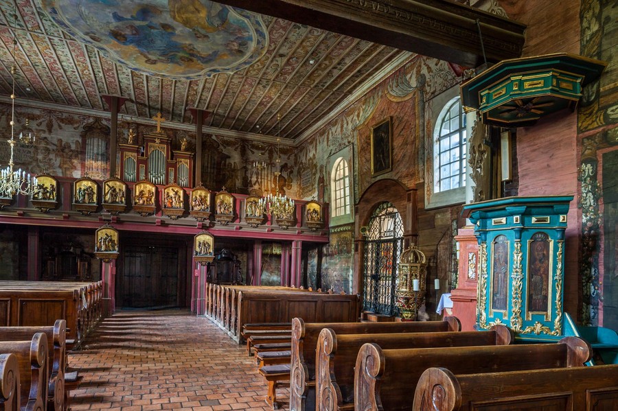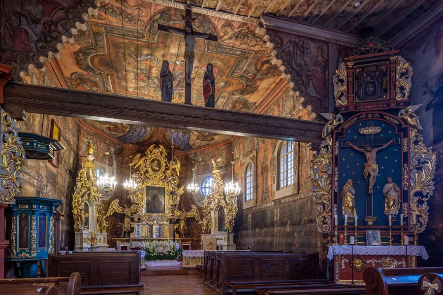 Gąsawa poszczycić się może prawdziwą perłą sztuki sakralnej. Niepozorny modrzewiowy kościół skrywa w swoich wnętrzach cenny barokowy zespół malowideł ściennych. To najwyższej klasy malarstwo iluzjonistyczne, wielowarstwowe, zwane arrasami lub gobelinami. Obok scen z ewangelii podziwiać możemy szereg postaci świętych, girlandy z kwiatów i owoców oraz florystyczne kartusze z inskrypcjami. Wnętrze kościoła to przekrój stylów od późnego gotyku, przez barok, manieryzm, klasycyzm, aż po współczesność. Późnobarokowemu ołtarzowi z cudownym obrazem Matki Bożej z pierwszej połowy XVIII w. świątynia zawdzięcza miano Sanktuarium Matki Bożej Pocieszenia.