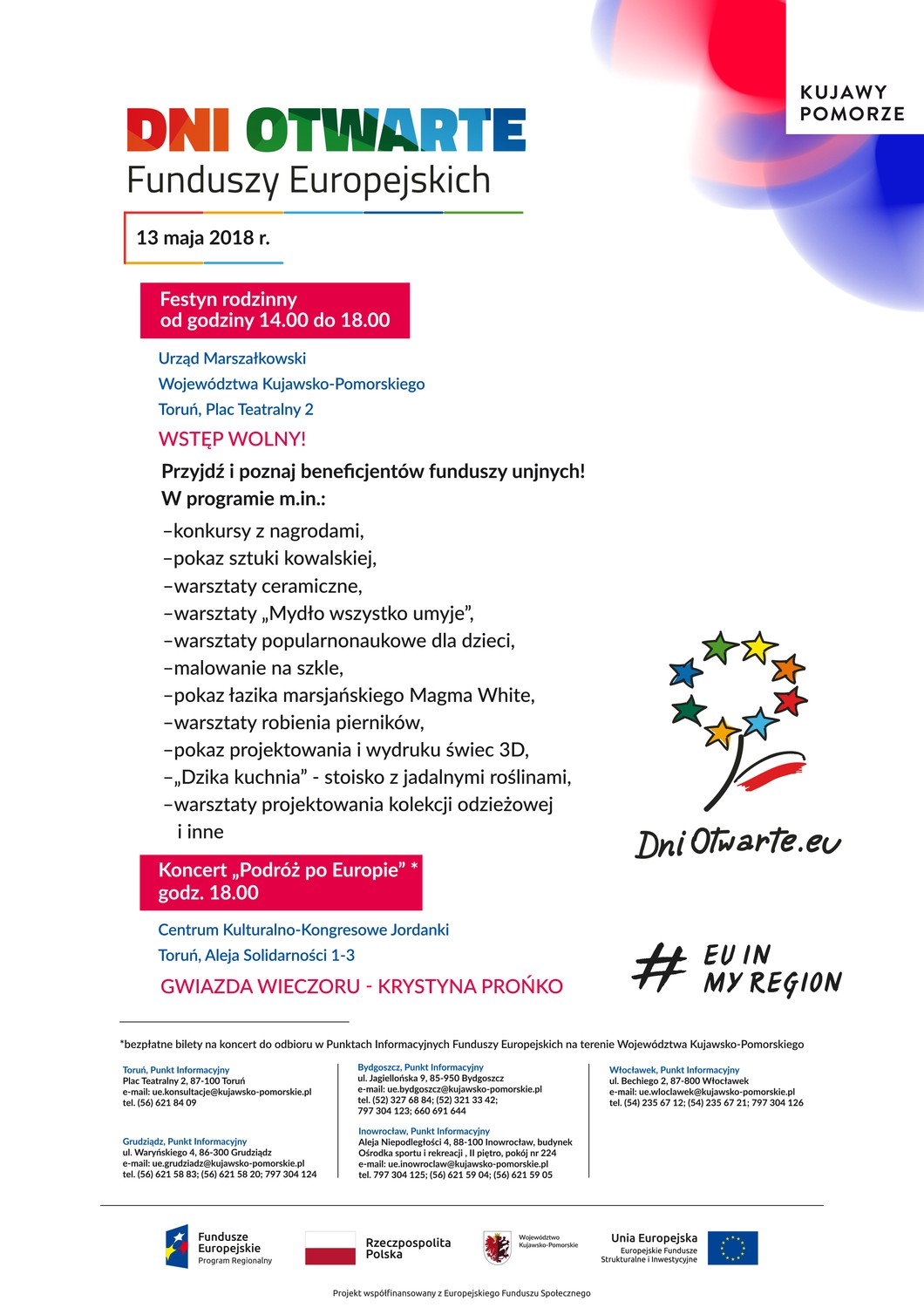 W ramach Dni Otwartych Funduszy Europejskich zaprosiliśmy również na koncert ,,Podróż po Europie”, który odbył się tego samego dnia w CKK Jordanki w Toruniu. Wystąpili Krystyna Prońko, Maria Rodriguez, Agnieszka Twardowska, Ewelina Przybyła, Wiktoria Węgrzyn, Marco Bocchino, Chris Schittulli i Paweł Wolsztyński. Koncert poprowadził Paweł Sztompke. Więcej.