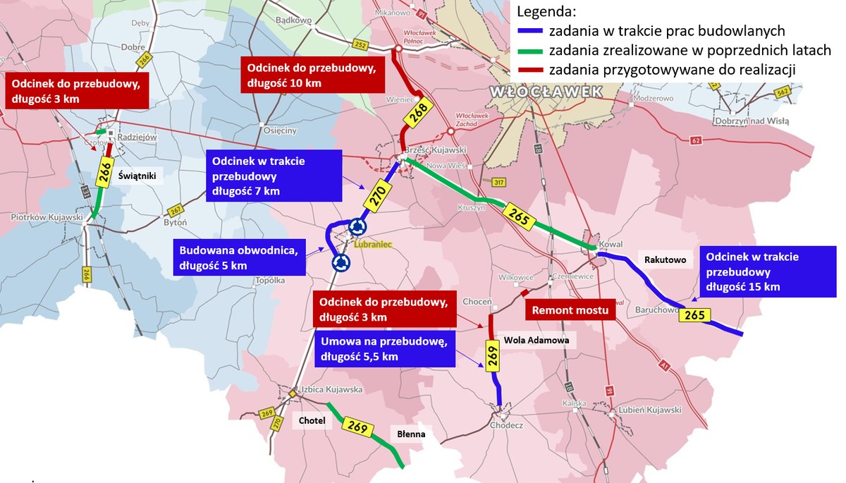 Przebudowa drogi wojewódzkiej nr 269 Choceń-Wola Adamowa to tylko jedna z kilku dużych inwestycji drogowych realizowanych na terenie powiatu włocławskiego.
