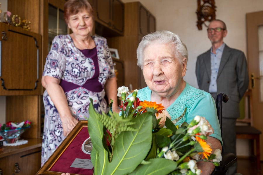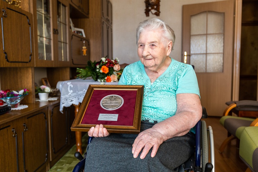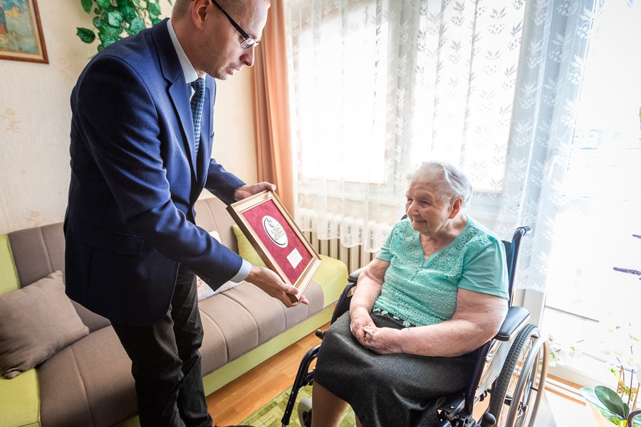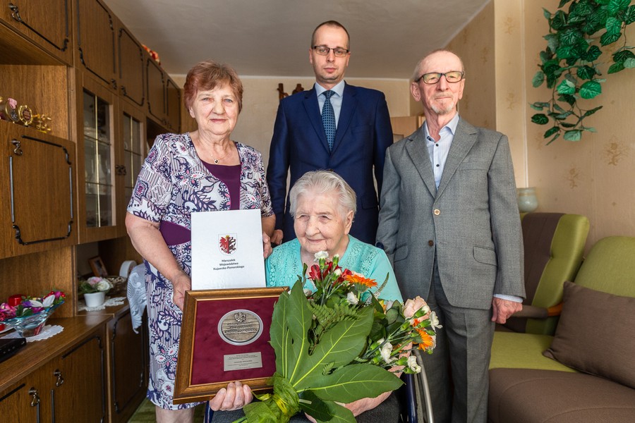 W styczniu 1922 roku w Brukach Unisławskich urodziła się Genowefa Mielcarska. W czasie wojny pracowała przymusowo w niemieckim gospodarstwie rolnym. W 1945 roku poślubiła Alfonsa, z którym zamieszkała w Toruniu. Poświęciła się prowadzeniu domu i macierzyństwu. Gród Kopernika jest jej domem aż do dzisiaj, gdzie mieszka wraz z córką. Mimo zaznanych trudności jest wciąż chętną do rozmowy i ciepłą osobą. Wizytę seniorce złożył 21 czerwca dyrektor z Urzędu Marszałkowskiego Jerzy Grochowski. Pełny biogram.