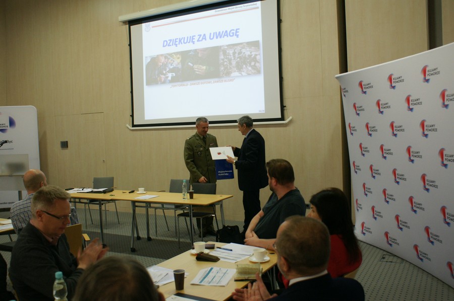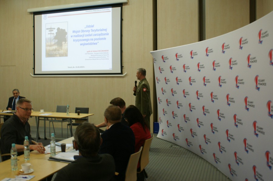 W następnym wystąpieniu, mającym miejsce po przerwie kawowej, p. ppłk dr Robert Reczkowski omówił udział wojsk obrony terytorialnej w realizacji zadań zarządzania kryzysowego na poziomie województwa. Prelegent szczególny akcent położył na udział dowództwa tworzonej 8. Kujawsko-Pomorskiej Brygady Obrony Terytorialnej w systemie zarządzania kryzysowego na szczeblu regionu.