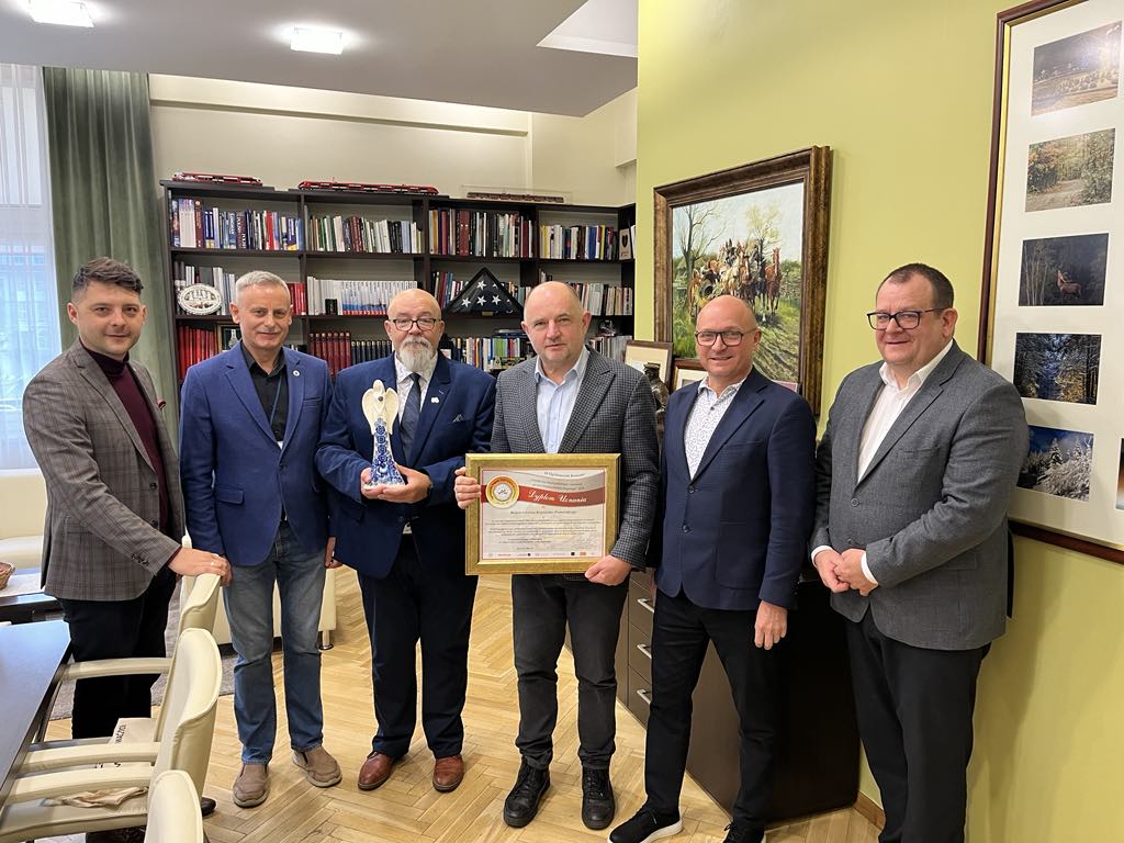 W dniu wczorajszym Robert Majewski Prezes Fundacji „Bezpieczni.eu” w obecności Marka Wojtkowskiego Członka Zarządu Województwa, Przemysława Dąbrowskiego Dyrektora Zarządu Dróg Wojewódzkich, Łukasza Kościelskiego Dyrektora Departamentu Infrastruktury Drogowej oraz Tomasz Grendzickiego Pełnomocnika ds. OIN przekazał Piotrowi Całbeckiemu Marszałkowi Województwa przedmiotowe wyróżnienie oraz w ramach podziękowania za wsparcie organizacji IV Kujawsko-Pomorskiego Sympozjum Bezpieczeństwa Ruchu Drogowego i Ratownictw Medycznego, które odbyło się 8-9 października br. we Włocławku wręczył statuetkę anioła z fajansu włocławskiego.