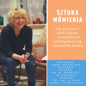 SZTUKA MÓWIENIA – zaproszenie do udziału w kursie Jak mówić, by skupić uwagę uczniów? Jaka gestykulacja podkreśli treść wypowiedzi? Co zrobić, żeby lekcja stała się miniteatrem? KPCEN w Toruniu zaprasza do udziału w kursie Sztuka mówienia. Jak panować nad ciałem i prawidłowo posługiwać się aparatem mowy prowadzonym przez Annę Magalską, aktorkę toruńskiego Teatru im. Wilama Horzycy. Czytaj dalej