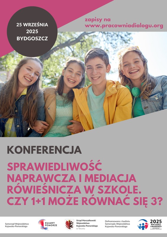 Konferencja „Sprawiedliwość naprawcza i mediacja rówieśnicza w szkole. Czy 1+1 równa się 3?” Zapraszamy na konferencję „Sprawiedliwość naprawcza i mediacja rówieśnicza w szkole. Czy 1+1 równa się 3?”. Adresatami szkolenia są wszyscy pracujący w szkole i z nią związani: nauczyciele, pedagodzy, psycholodzy szkolni, [...] Czytaj dalej