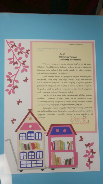 Dnia 26.10.2017 w Klinice Psychiatrii Dzieci i Młodzieży Szpitala Uniwersyteckiego Nr 1 w Bydgoszczy pojawił się wyjątkowy gość. Pan Jarosław Leciejewski z poznańskiej fundacji „Serdecznik” przywiózł nam wspaniały podarunek. Jest nim bajkowóz – czyli wędrująca szpitalna biblioteka. Z tej okazji nauczyciele pracujący na oddziale przygotowali niespodziankę – przedstawienie, którego scenariusz został napisany właśnie na tę okazję.