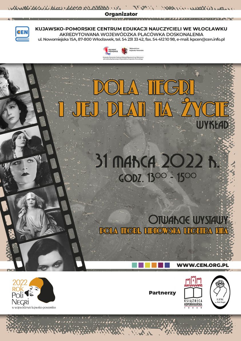 Z okazji Roku Poli Negri, Kujawsko-Pomorskie Centrum Edukacji Nauczycieli we Włocławku 31 marca zaprasza na wykład   „Pola Negri i jej plan na życie”, który adresowany jest do nauczycieli, wychowawców, bibliotekarzy, instytucji kultury, samorządów i organizacji pozarządowych.