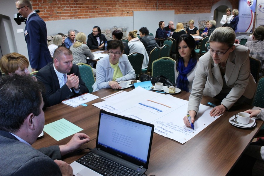 Dyrektor KPCEN we Włocławku – Grażyna Troszyńska – przedstawiła wnioski wypracowane przez uczestników sześciu sesji powiatowych. Stały się one punktem wyjścia do pracy metodą World Café w 4 grupach panelowych.