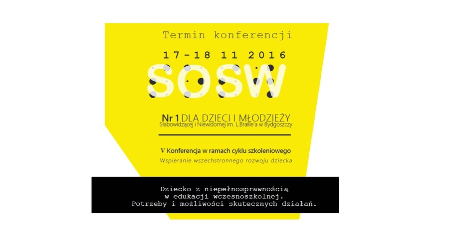 W dniach 17-18.11.2016 r. odbyła się w bydgoskim Ośrodku im. L. Braille’a V konferencja naukowa w ramach cyklu szkoleniowego ‘Wspieranie wszechstronnego rozwoju dziecka’ pt.: Dziecko z niepełnosprawnością w edukacji wczesnoszkolnej. Potrzeby i możliwości skutecznych działań”. Patronat honorowy sprawowali Marszałek Województwa Kujawsko-Pomorskiego Piotr Całbecki i Prezydent Bydgoszczy Rafał Bruski. W spotkaniu uczestniczyło 90 osób.