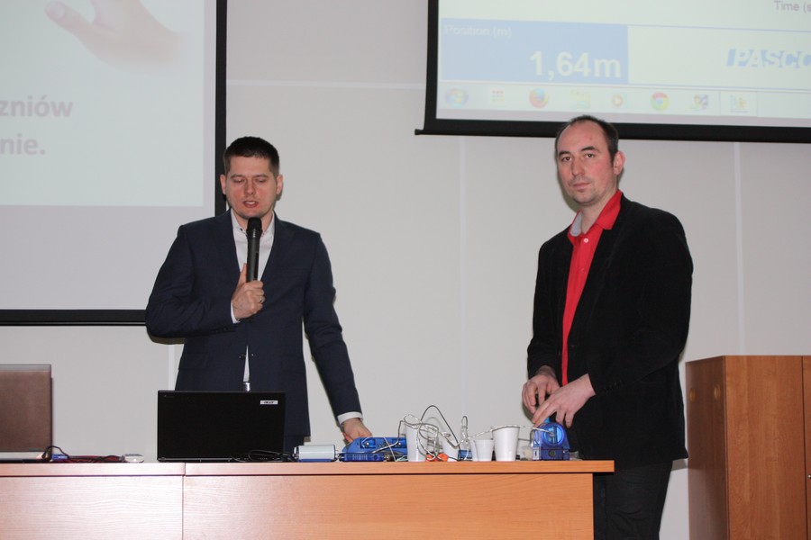 Violetta Panfil-Smolińska i Ryszard Szczerban, nauczyciele konsultanci w Kujawsko-Pomorskim Centrum Edukacji Nauczycieli w Bydgoszczy, przedstawili również ofertę szkoleń dla nauczycieli w zakresie zastosowania czujników PASCO na zajęciach dydaktycznych.