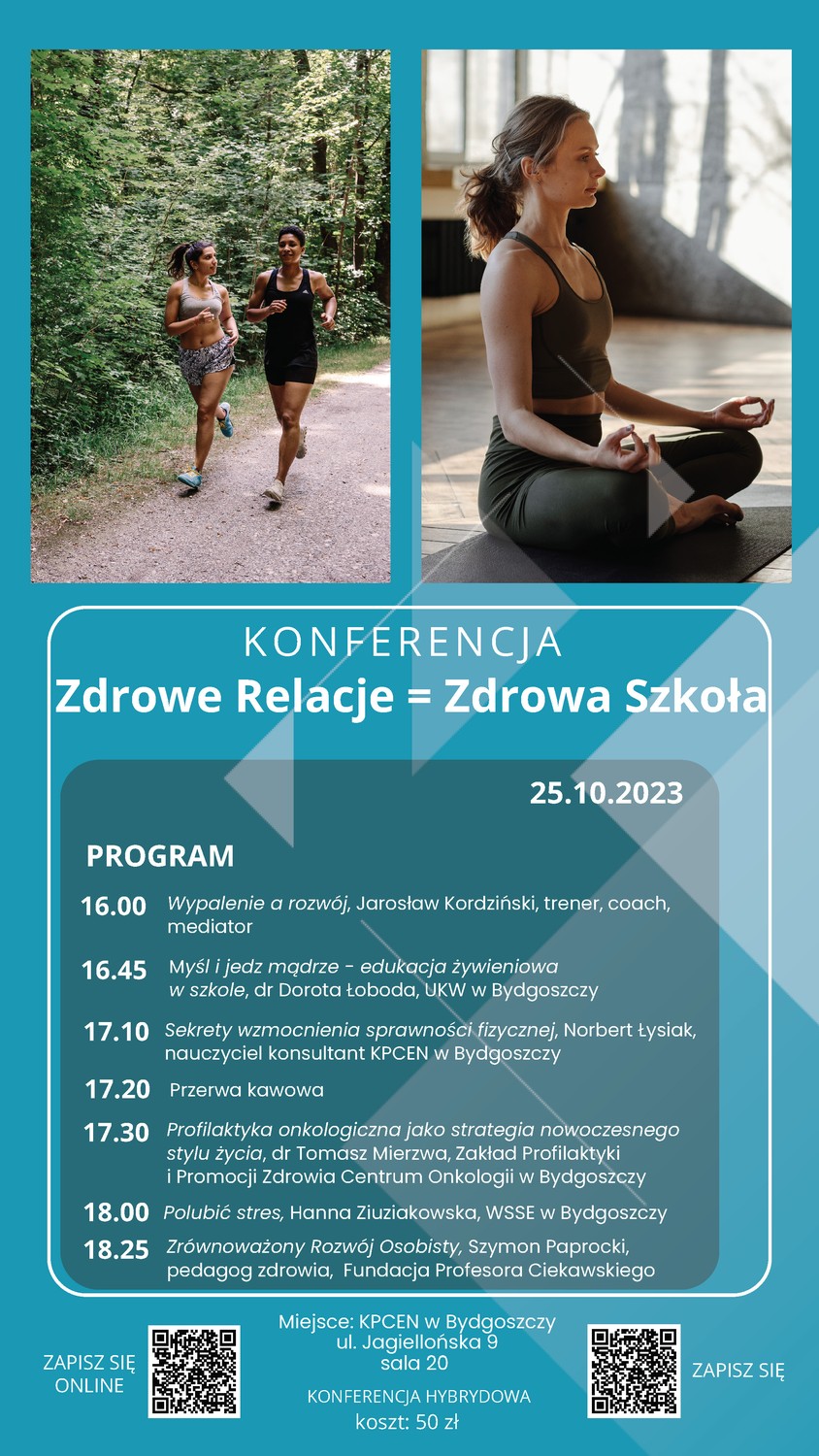 Kujawsko-Pomorskie Centrum Edukacji Nauczycieli w Bydgoszczy zaprasza na konferencję ZDROWE RELACJE = ZDROWA SZKOŁA, która odbędzie się 25 października 2023 roku o godz. 16.00 w formule hybrydowej. Koszt konferencji wynosi 50 zł. Zapisy trwają do 24 października br.