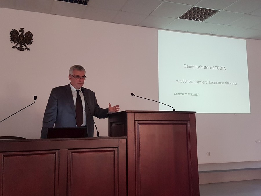 Po przerwie kawowej Kazimierz Mikulski starszy wizytator Wydziału Edukacji Ponadpodstawowej, Specjalnej i Placówek Kuratorium Oświaty w Bydgoszczy przedstawił temat Elementy historii robota. W 500 lecie śmierci Leonarda da Vinci. Przypomniał, że prekursorem dzisiejszych pomysłów na roboty jest Leonardo da Vinci, który ponad 500 lat temu skonstruował m.in. mechanicznego chodzącego lwa. Autor prezentacji podkreślił, że urządzenie było nakręcane i potrafiło kręcić głową, otwierać paszczę i machać ogonem. Kazimierz Mikulski zaprezentował także rekonstrukcję mechanicznego rycerza Leonarda, który miał służyć do celów obronnych, a seria mechanizmów – jak podkreślił autor prezentacji – pozwalała robotowi stać, siedzieć, przesuwać ramionami, szyją i podnosić daszek zbroi. Przedstawił też inne urządzenia włoskiego geniusza, w tym między innymi model samobieżnego wózka, programowalny samochód z napędem na przednie koła z mechanizmami zawieszenia, pierwsze zaawansowane ramię robota z czterema stopniami swobody i analogowym kontrolerem miejscowym oraz dłoń. Starszy wizytator przypomniał także, że po raz pierwszy terminu robot użył czeski pisarz Karel Čapek w 1920 roku w swojej sztuce Rossum’s Universal Robots, a burzliwy początek robotyki jako dziedziny wiedzy i nauki rozpoczął się w 1961 roku. Przedstawił także rozwój robotyki i wyjaśnił różnice między robotami I, II i III generacji. Kazimierz Mikulski podzielił się także z uczestnikami konferencji ciekawostkami z tej dziedziny, m.in. zdalnie sterowaną robo-łodzią Nicola Tesli.
