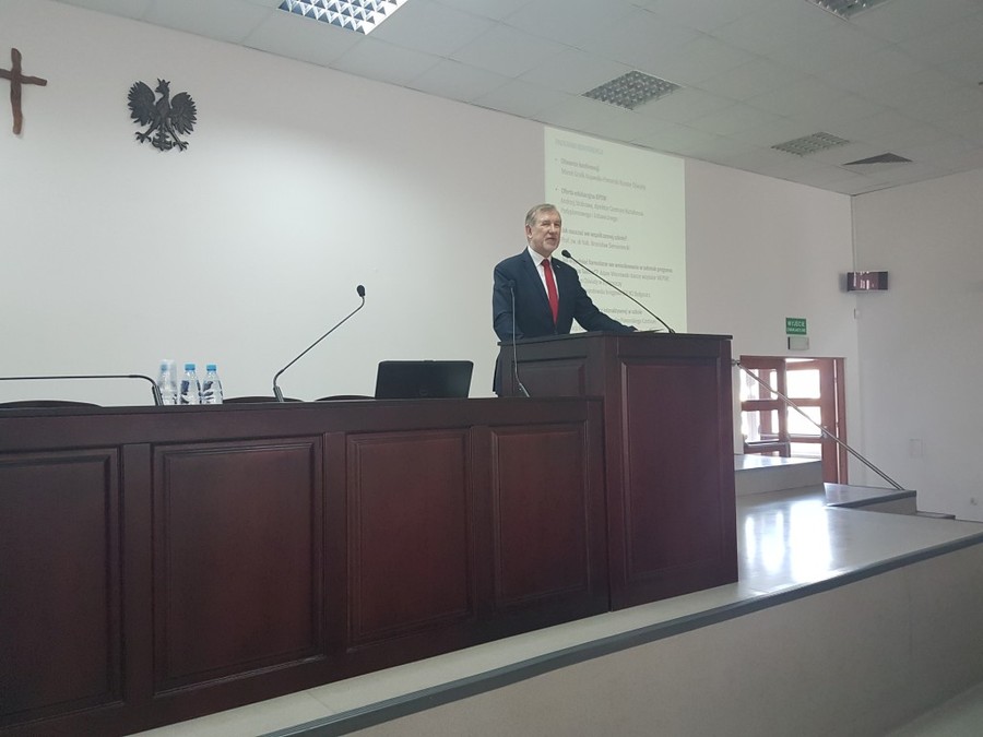 Następnie głos zabrał gospodarz obiektu Andrzej Stobrawa dyrektor Centrum Kształcenia Podyplomowego i Ustawicznego Kujawsko-Pomorskiej Szkoły Wyższej w Bydgoszczy. W swoim wystąpieniu zaprezentował ofertę edukacyjną uczelni w zakresie studiów magisterskich, inżynierskich, licencjackich, podyplomowych oraz specjalistycznych kursów. Podkreślił dużą rolę jaką KPSW przykłada do jakości kształcenia przyszłych absolwentów i zachęcił zebranych do ciągłego zdobywania wiedzy i doskonalenia umiejętności.