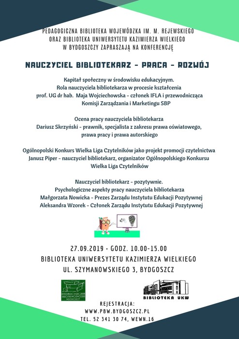 Pedagogiczna Biblioteka Wojewódzka im. Mariana Rejewskiego oraz Biblioteka Uniwersytetu Kazimierza Wielkiego w Bydgoszczy serdecznie zapraszają na bezpłatną konferencję dla bibliotekarzy i nauczycieli bibliotekarzy pt. „Nauczyciel bibliotekarz – praca – rozwój”, która odbędzie się 27 września 2019 roku.