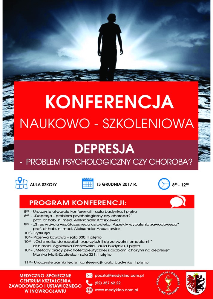 Dyrektor Medyczno-Społecznego Centrum Kształcenia Zawodowego i Ustawicznego w Inowrocławiu, zaprasza wszystkich zainteresowanych do udziału w konferencji naukowo-szkoleniowej pod hasłem: „Depresja – problem psychologiczny czy choroba”.