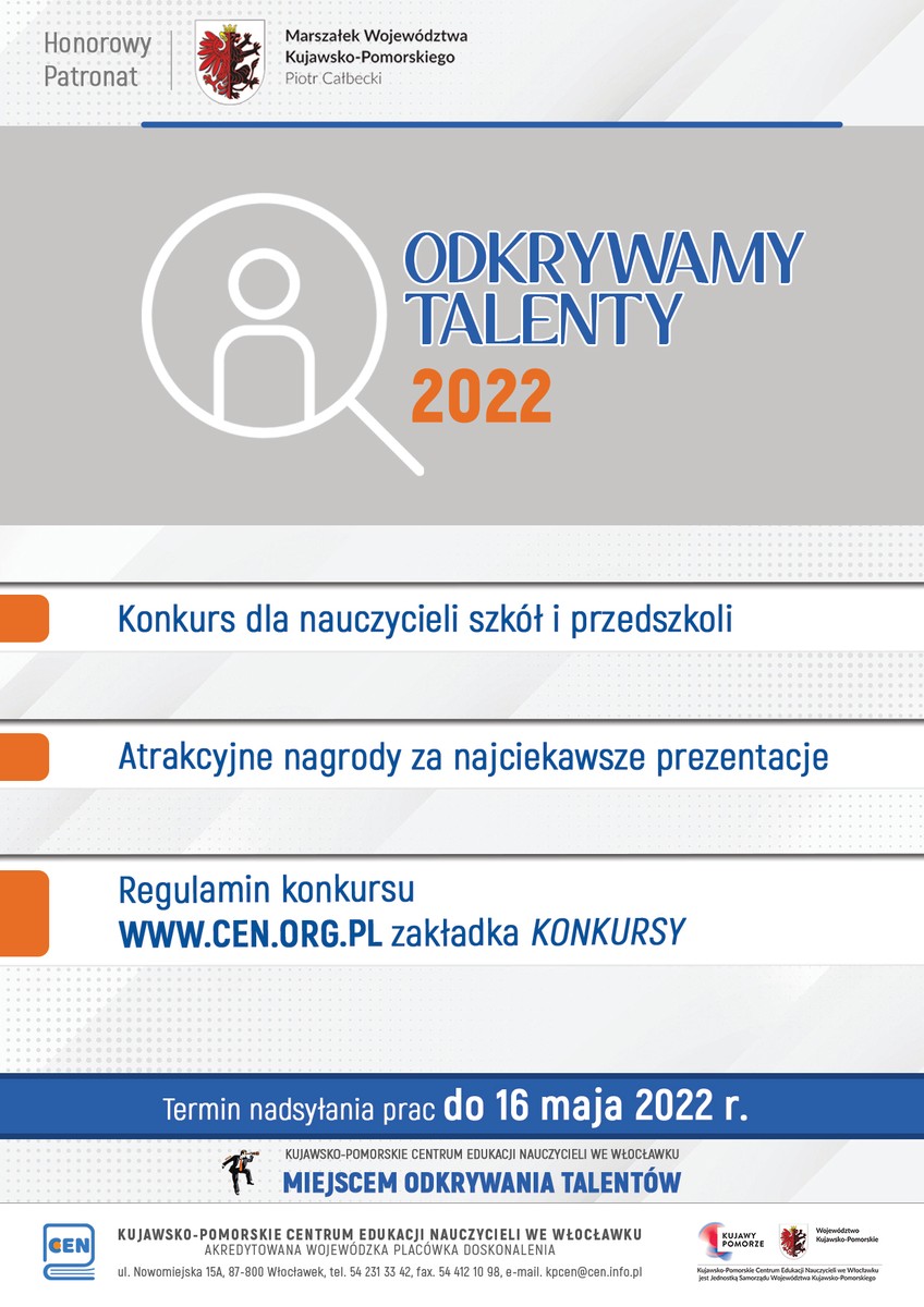 Kujawsko-Pomorskie Centrum Edukacji Nauczycieli we Włocławku zaprasza nauczycieli szkół i przedszkoli do udziału w kolejnej edycji Konkursu Odkrywamy Talenty 2022. Konkurs objęty został honorowym patronatem Marszałka Województwa Kujawsko-Pomorskiego.