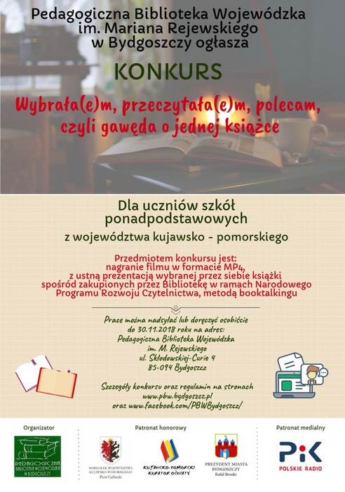 Pedagogiczna Biblioteka Wojewódzka im. Mariana Rejewskiego w Bydgoszczy ogłasza konkurs „Wybrała(e)m, przeczytała(e)m, polecam, czyli gawęda o jednej książce”. Jest on adresowany do uczniów szkół ponadpodstawowych z województwa kujawsko-pomorskiego.