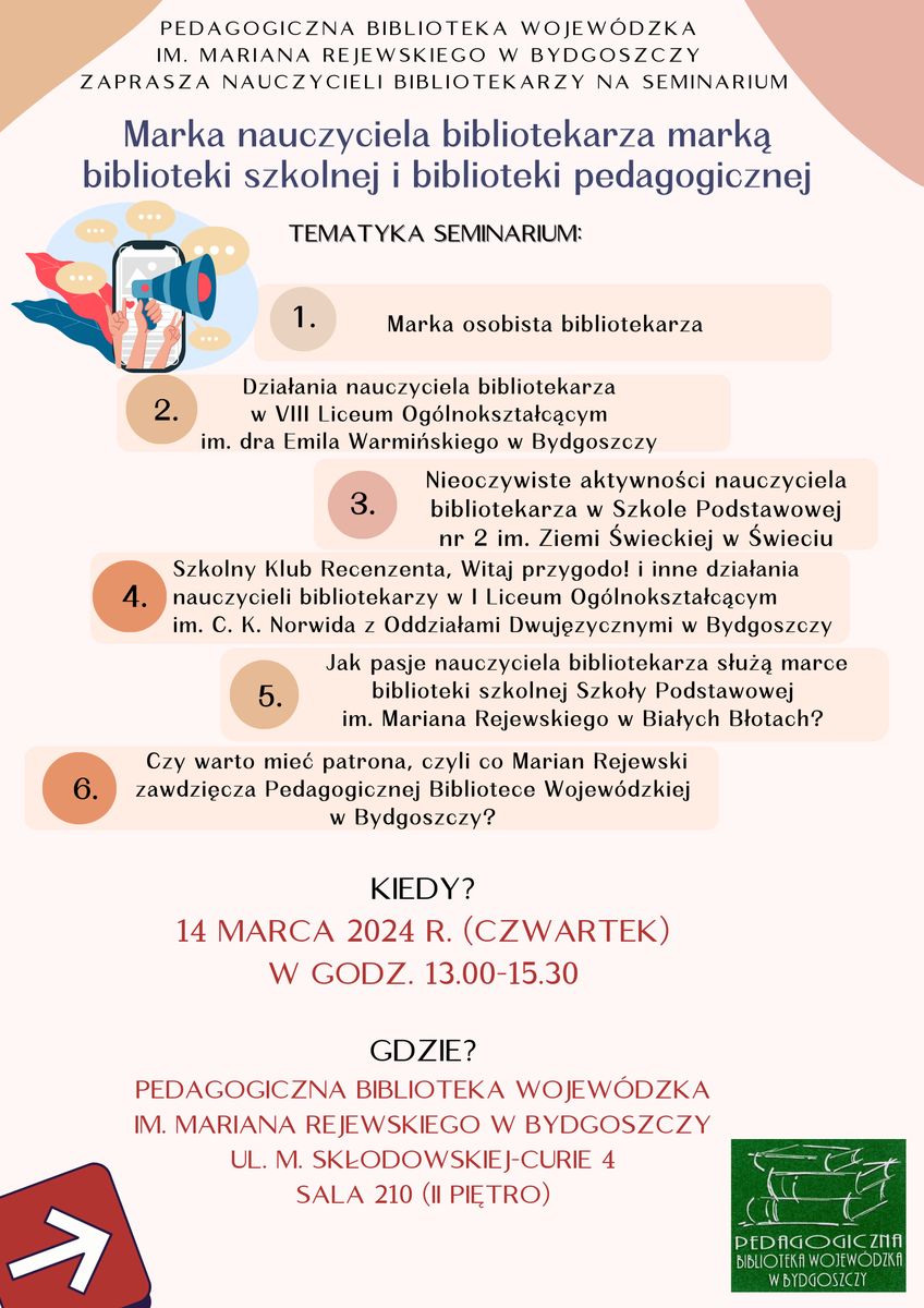 Pedagogiczna Biblioteka Wojewódzka im. M. Rejewskiego w Bydgoszczy zaprasza na seminarium dla nauczycieli bibliotekarzy, które odbędzie się 14 marca 2024 roku w godz. 13.00-15.30 w siedzibie biblioteki przy ul. M. Skłodowskiej-Curie 4, w sali 210 (II piętro).