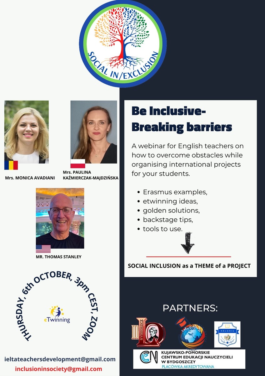 Kujawsko-Pomorskie Centrum Edukacji Nauczycieli w Bydgoszczy oraz Międzynarodowe Stowarzyszenie Nauczycieli Języka Angielskiego IELTA Poland zapraszają wszystkich nauczycieli języka angielskiego na webinarium Be inclusive – breaking barriers, które odbędzie się 6 października o godz. 15:00 na platformie Zoom.