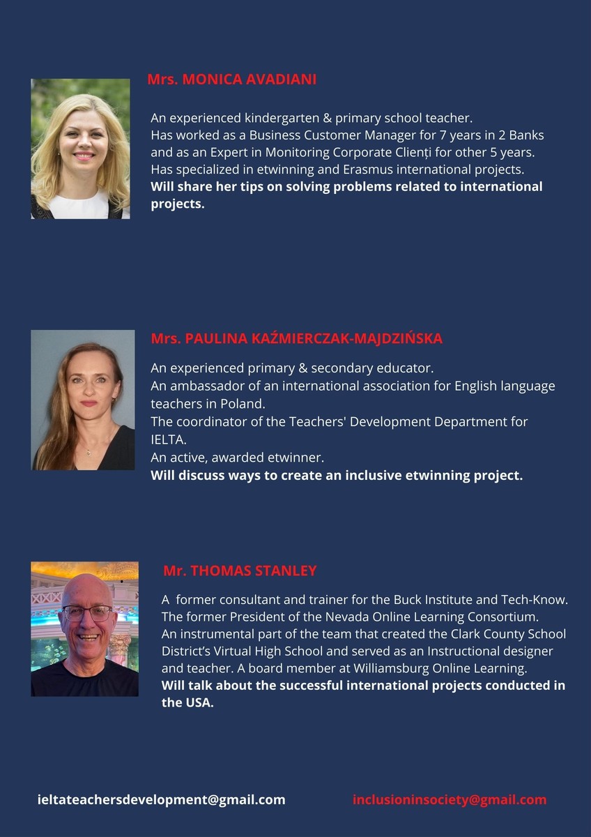Celem szkolenia jest dostarczenie nauczycielom przydatnych wskazówek, jak radzić sobie z trudnościami związanymi z realizacją projektów online ze swoimi uczniami. Szkolenie przeprowadzone zostanie w języku angielskim przez międzynarodowych ekspertów. Dzień przed szkoleniem zarejestrowani uczestnicy otrzymają link do połączenia z platformą.