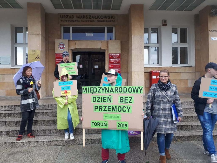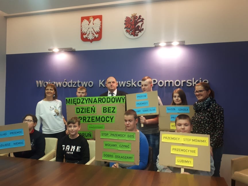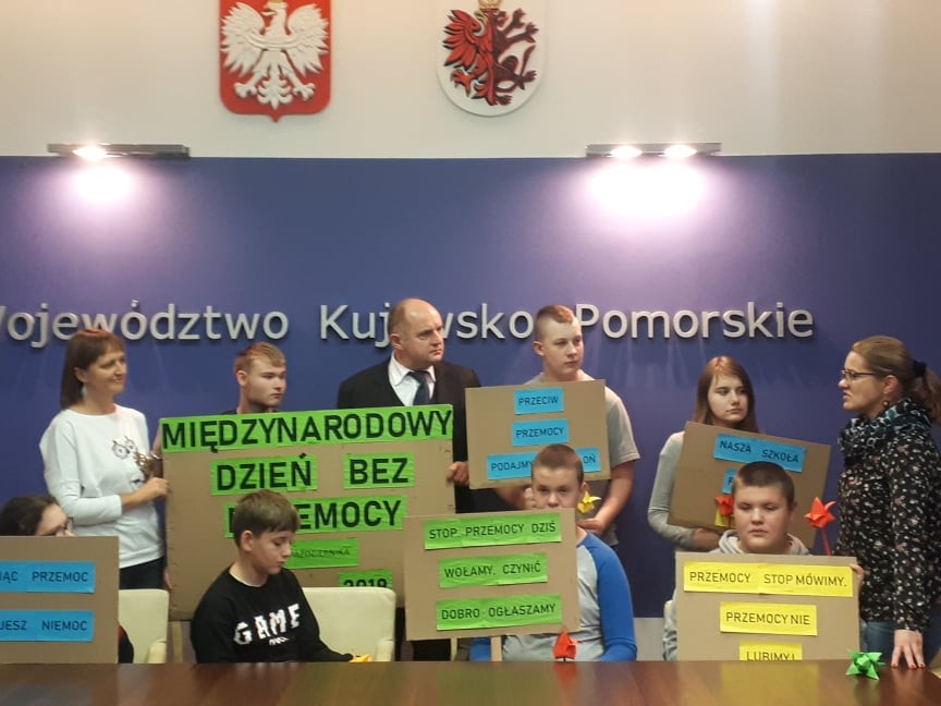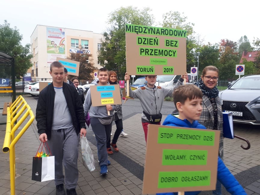 Nasi przedstawiciele wybrali się w ramach akcji do centrum miasta, aby propagować zasadę unikania i zwalczania jakiejkolwiek przemocy. Rozdawali przechodniom Kodeks życzliwości i własnoręcznie wykonane kwiatki origami i życzyli każdemu „Miłego dnia”. Odwiedzili Marszałka Województwa Kujawsko-Pomorskiego pana Piotra Całbeckiego, który wyraził słowa uznania za włączenie się naszej szkoły w tą ważną międzynarodową akcję.