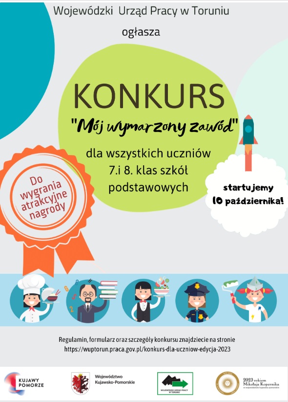 Wojewódzki Urząd Pracy w Toruniu organizuje konkurs „Mój wymarzony zawód” dla uczniów 7. i 8. klas szkół podstawowych z terenu województwa kujawsko-pomorskiego. Celem przedsięwzięcia jest kształtowanie u młodych osób aktywnej postawy wobec życia zawodowego poprzez zwiększanie wiedzy i świadomości na temat rynku pracy, zawodów, wymagań pracodawców. Istotne jest, by uczniowie wiedzieli, że decyzje podejmowane na etapie ostatnich klas szkół podstawowych mogą mieć znaczący wpływ na ich przyszłość zawodową.