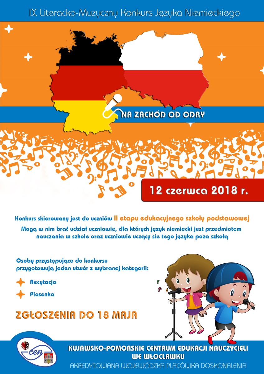 Zapraszamy do udziału w IX edycji Literacko-Muzycznego Konkursu Języka Niemieckiego „Na Zachód od Odry”, która odbędzie się 12 czerwca w KPCEN we Włocławku.