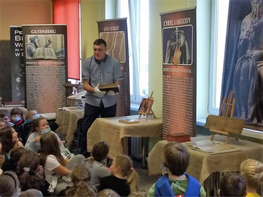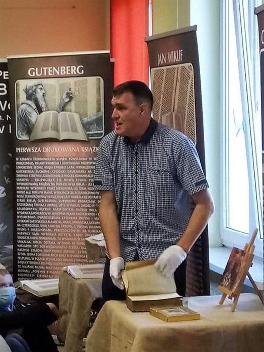 Autor kolekcji oprowadzał po wystawie i w bardzo interesujący, przystępny sposób opowiadał o zgromadzonych egzemplarzach, inspirując jednocześnie licznie przybyłą młodzież i dzieci do czytania Biblii.
