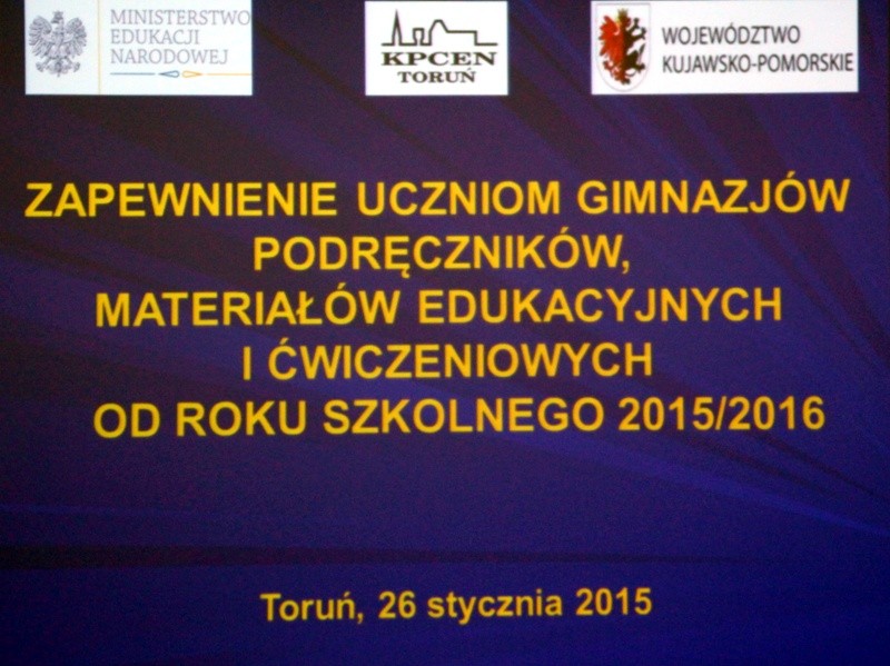 Dyrektorzy gimnazjów uczestniczyli w konferencji Zapewnienie uczniom gimnazjów podręczników, materiałów edukacyjnych i ćwiczeniowych od roku szkolnego 2015/2016, która odbyła się na zlecenie Ministerstwa Edukacji Narodowej, 26 stycznia 2015 r. w Urzędzie Marszałkowskim. Organizatorem spotkania było Kujawsko-Pomorskie Centrum Edukacji Nauczycieli w Toruniu; jego uczestniczką była m.in. Danuta Brzózka-Ciechanowska, p.o. dyrektora Delegatury Kuratorium Oświaty w Toruniu.