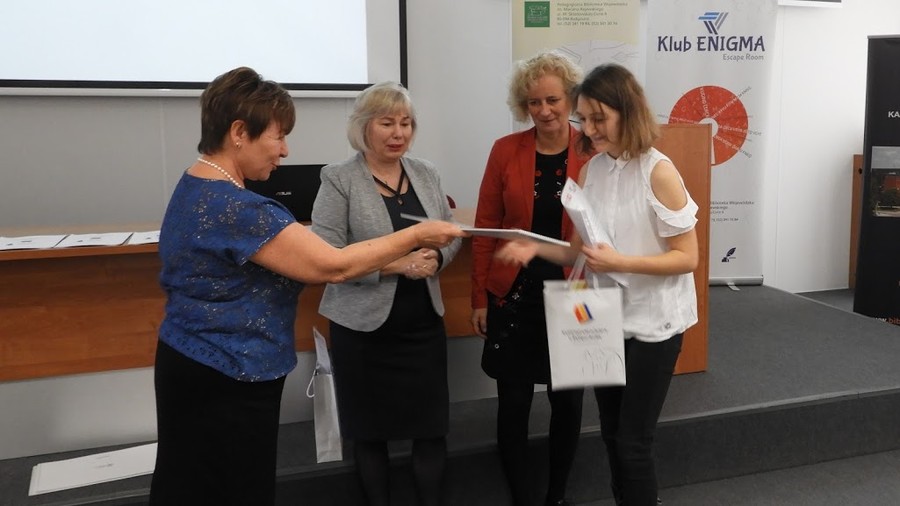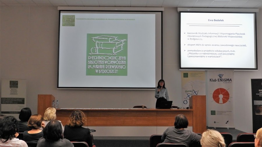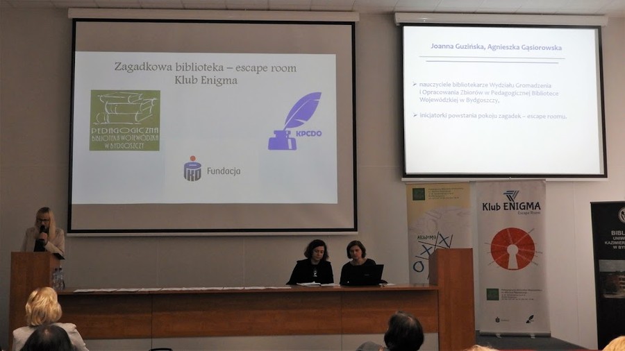 Kolejne prelegentki, Joanna Guzińska i Agnieszka Gąsiorowska, nauczyciele bibliotekarze Wydziału Gromadzenia i Opracowania Zbiorów Pedagogicznej Biblioteki Wojewódzkiej podkreśliły znaczenie tajemniczego pokoju zagadek w wystąpieniu „Zagadkowa biblioteka, czyli escape room w bibliotece”.
