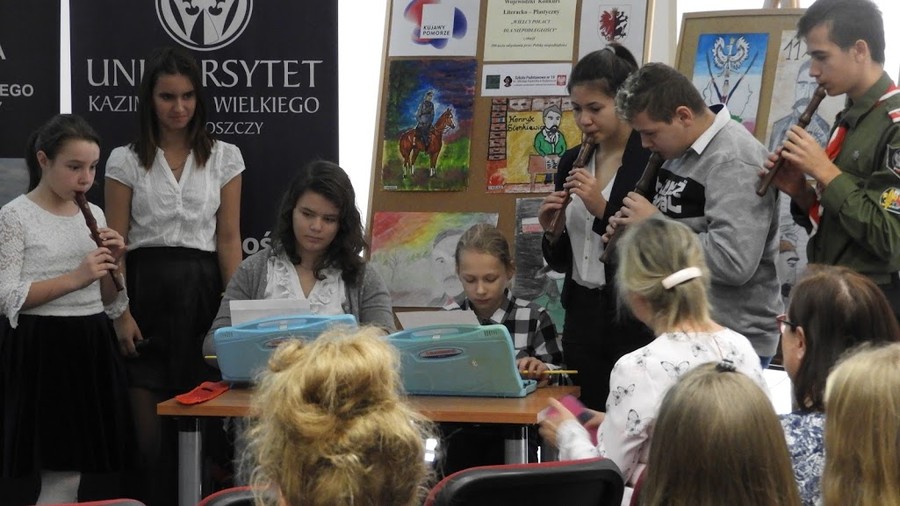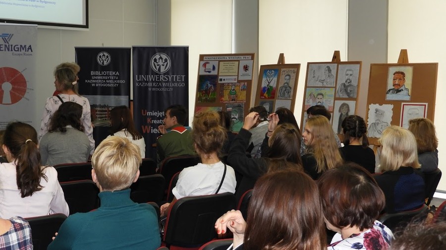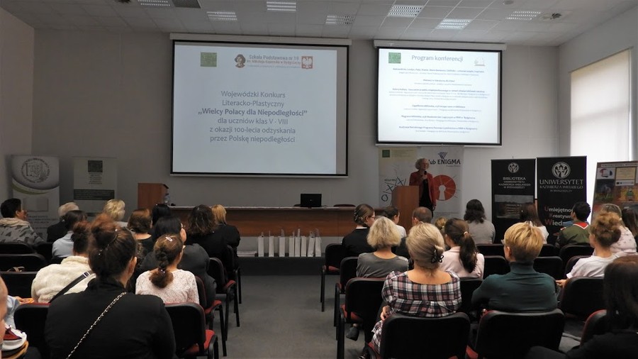 Pierwszym punktem konferencji było podsumowanie wojewódzkiego konkursu literacko-plastycznego dla uczniów klas V-VIII szkół podstawowych „Wielcy Polacy dla niepodległości”, zorganizowanego przez Pedagogiczną Bibliotekę Wojewódzką im. Mariana Rejewskiego oraz Szkołę Podstawową nr 19 im. Mikołaja Kopernika w Bydgoszczy. Dyrektor wspomnianej szkoły, Agata Szumińska oraz nauczyciel bibliotekarz Pedagogicznej Biblioteki Wojewódzkiej, Małgorzata Tyczyńska przedstawiły cele oraz wyniki konkursu. Uczniowie SP nr 19 zaprezentowali krótki pokaz słowno-muzyczny.