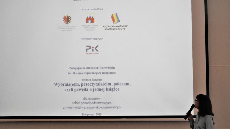 Nagradzanie laureatów, fot. PBW im. M. Rejewskiego w BydgoszczyPodsumowanie konkursu - Dyrektor SP nr 19, fot. PBW im. M. Rejewskiego w BydgoszczyPrelegentka Ewa Bedełek, fot. PBW im. M. Rejewskiego w BydgoszczyPrelegentka Ewa Bedełek-NPRCz, fot. PBW im. M. Rejewskiego w BydgoszczyPrelegentka Joanna Kotwicka, fot. PBW im. M. Rejewskiego w BydgoszczyPrelegentka Małgorzata Wdowczyk, fot. PBW im. M. Rejewskiego w BydgoszczyPrelegentka Wiesława Jędrzejczykowa, fot. PBW im. M. Rejewskiego w BydgoszczyPrelegentki Ewa Bielska i Justyna Frelichowska, fot. PBW im. M. Rejewskiego w BydgoszczyPrelegentki Joanna Guzińska i Agnieszka Gąsiorowska, fot. PBW im. M. Rejewskiego w BydgoszczyProwadzące konferencję, Beata Cieślińska i Agnieszka Handzel, fot. PBW im. M. Rejewskiego w BydgoszczyPubliczność konferencyjna, w tle nagrodzone prace, fot. PBW im. M. Rejewskiego w BydgoszczyWystęp słowno-muzyczny, fot. PBW im. M. Rejewskiego w BydgoszczyZaproszeni goście, na pierwszym planie dyrektor PBW Ewa Pronobis-Sosnowska, fot. PBW im. M. Rejewskiego w Bydgoszczy