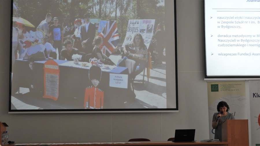 Po półgodzinnej przerwie kawowej kolejny gość, Joanna Kotwicka przedstawiła prelekcję „Kolory kultury – tworzenie projektu międzykulturowego w ramach działań biblioteki szkolnej”. Pani Joanna jest nauczycielem bibliotekarzem oraz nauczycielem etyki w Zespole Szkół nr 1 im. Bartłomieja z Bydgoszczy w Bydgoszczy, a także doradcą metodycznym w Miejskim Ośrodku Edukacji Nauczycieli w zakresie edukacji ucznia cudzoziemskiego i reemigranta oraz wiceprezesem Fundacji Asante.
